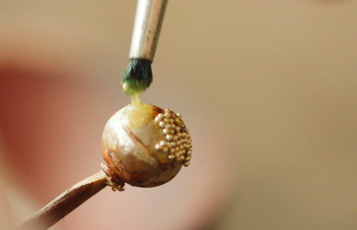 Im nächsten Schritt werden die Jawans sorgsam von Hand aufgetragen. Dabei sind Geduld und viel Geschick erforderlich, um die filigranen Kügelchen gleichmäßig auf der Oberfläche anzubringen. Hierzu wird Klebstoff verwendet, der aus den Samen einer auf Bali heimischen Pflanze (Pling Pling) gewonnen wird. Den gesamten Ablauf kannst Du Dir in unserem “MAKING OF “ ansehen.