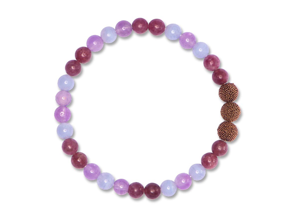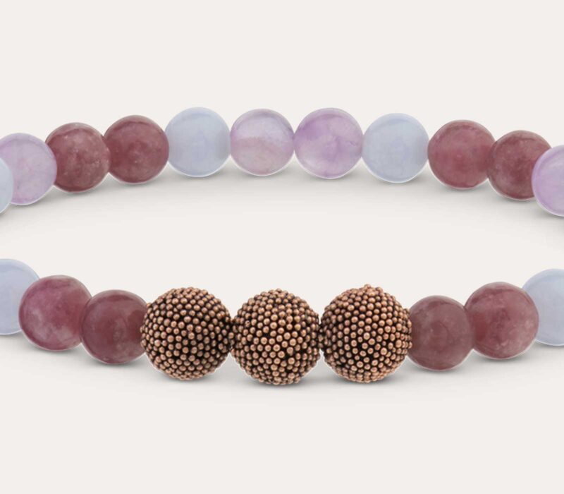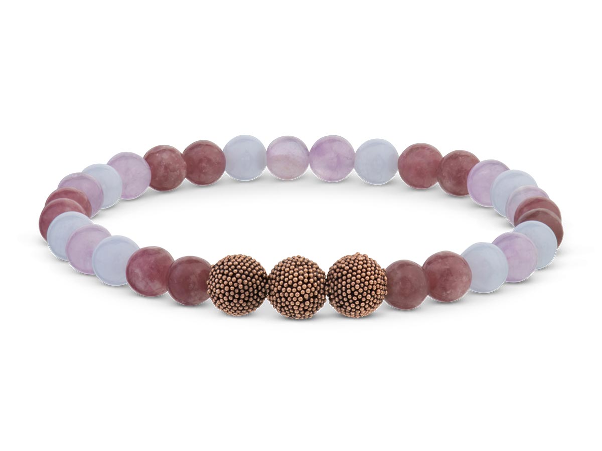 Lavendel Amethyst ist ein dezenter Farbschmeichler. Das hell- bis dunkelviolette Mineral ist glasig und Flecken in blassem Violett wechseln sich mit dunkleren Schatten ab. Lepidolith wird von unterschiedlich starken Adern marmoriert, was ihm einen ausdrucksvollen Charakter verleiht. Der für dieses Armband verwendete blaue Spitzenachat besitzt einen weichen, hellblauen Grundton und wird durch feine, wellenförmige Bänder in helleren wie kräftigeren Blautönen durchzogen.