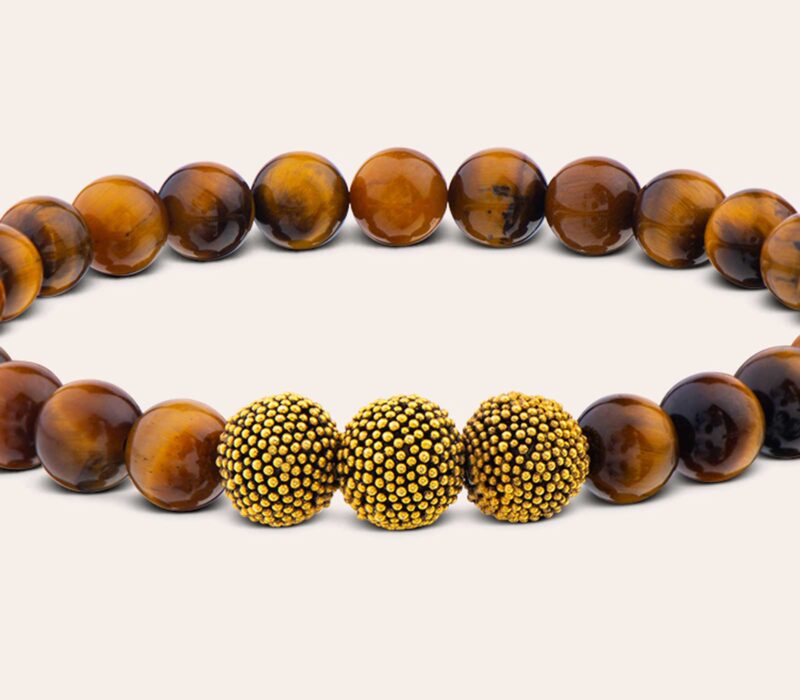 Das braune Tigerauge ist mit Schlieren aus Farbtönen von Karamell bis Mokka überzogen. Dadurch changiert das Farbspiel je nach Lichteinfall und -intensität von goldgelb bis goldbraun und erzeugt so ein schillerndes Farbspiel, das wie das Auge eines Tigers wirkt.