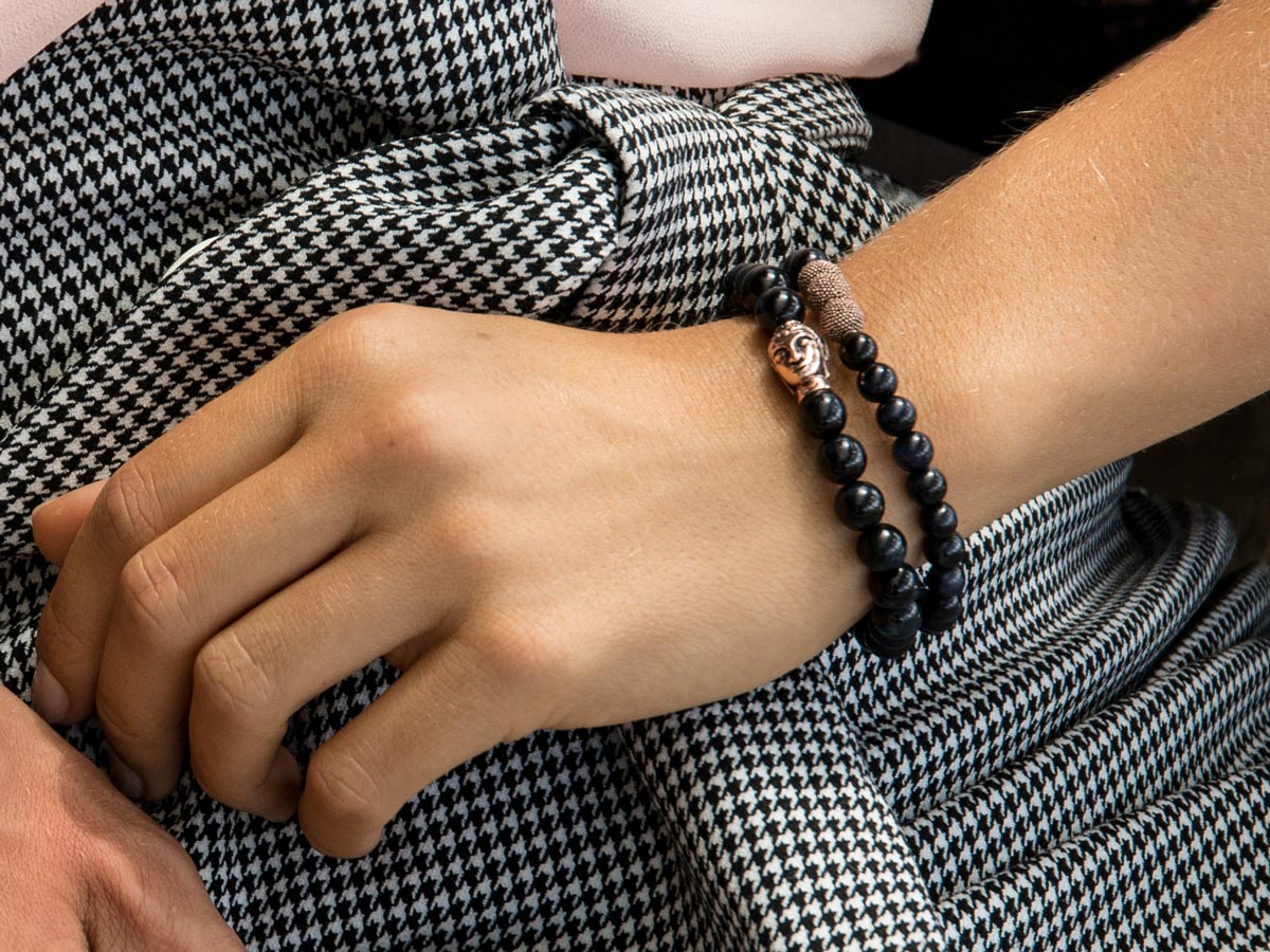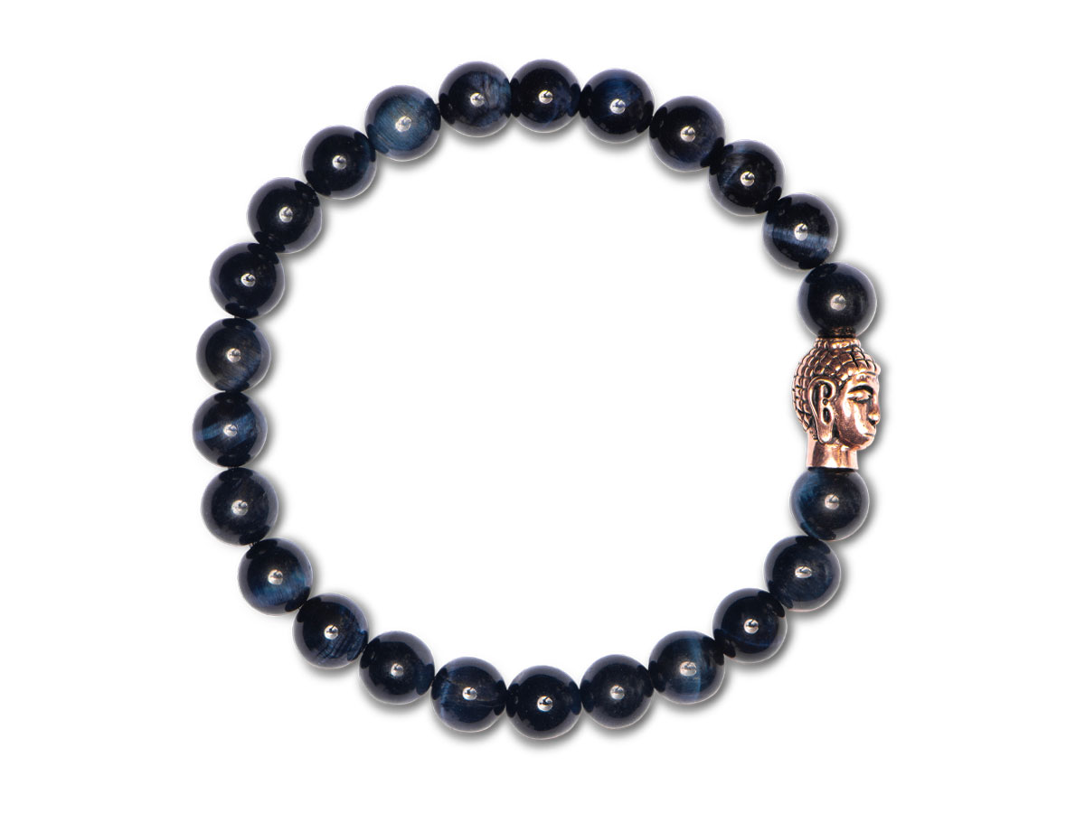 Das Ruhe ausstrahlende blaue Tigerauge in 8 mm besticht an diesem Damenarmband durch die stilvolle Symbiose mit edlem Roségold des vergoldeten Buddha für einen dezenten Akzent an Deinem Handgelenk – einfach unkompliziert schön für ein elegantes Statement.