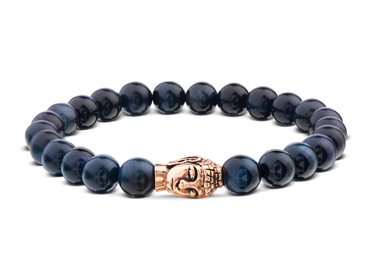 Die Ruhe ausstrahlenden Beads des blauen Tigerauges in 8 mm bestechen an diesem Damenarmband durch die stilvolle Symbiose mit edlem Roségold des vergoldeten Buddha für einen eleganten Akzent an Deinem Handgelenk. Einfach unkompliziert schön und minimalistisch für ein dezentes Statement.