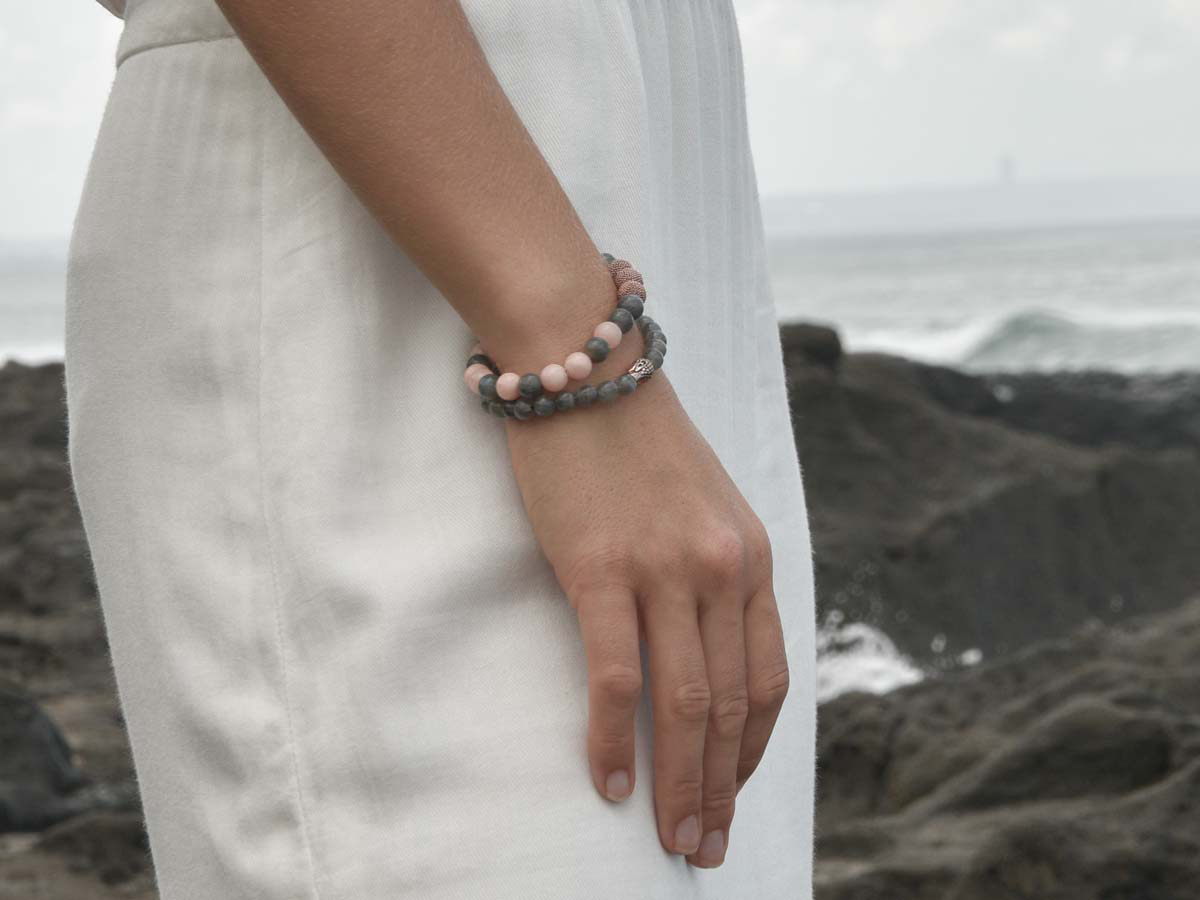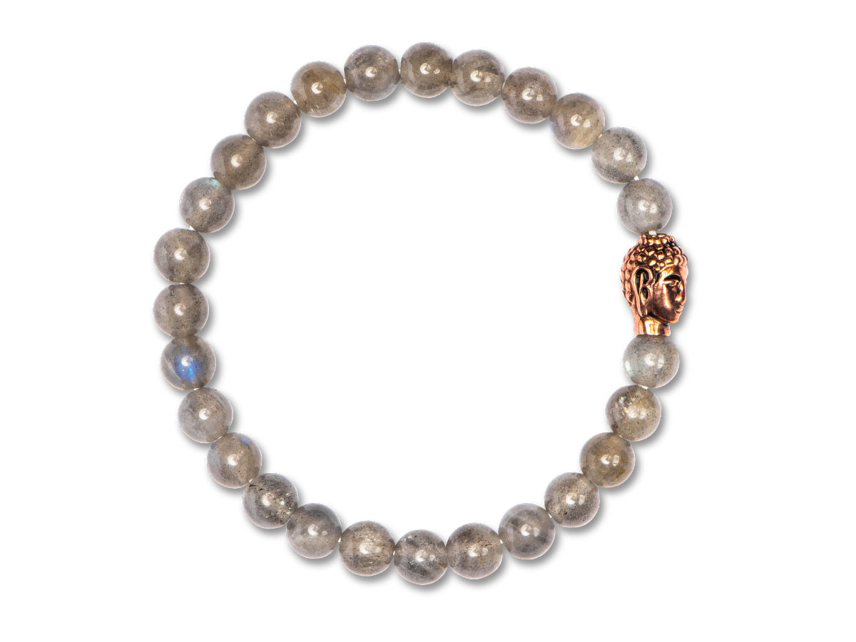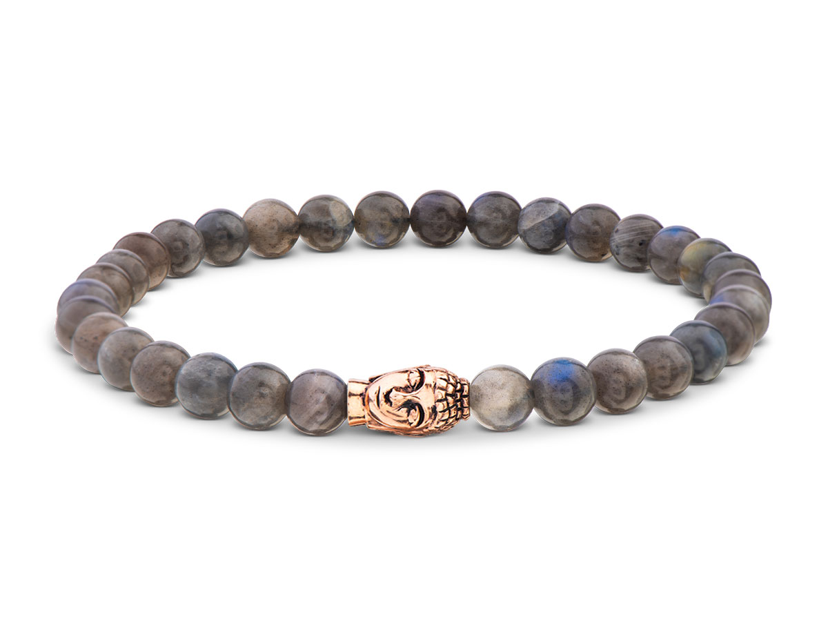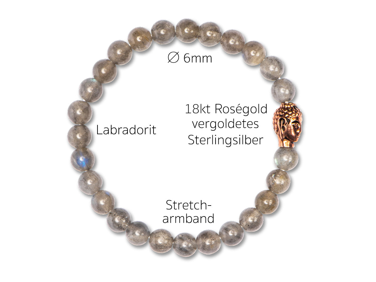 Eine klassische Kombination aus Rosé und Grau interpretiert mit Labradorit in 6 mm verleiht diesem Damenarmband einen betont femininen Touch. Der in Roségold vergoldete Buddha ergänzt die schlichte Farbgebung harmonisch und erzeugt einen edlen Blickfang im zurückhaltenden Auftreten dieses Buddha Armbands.
