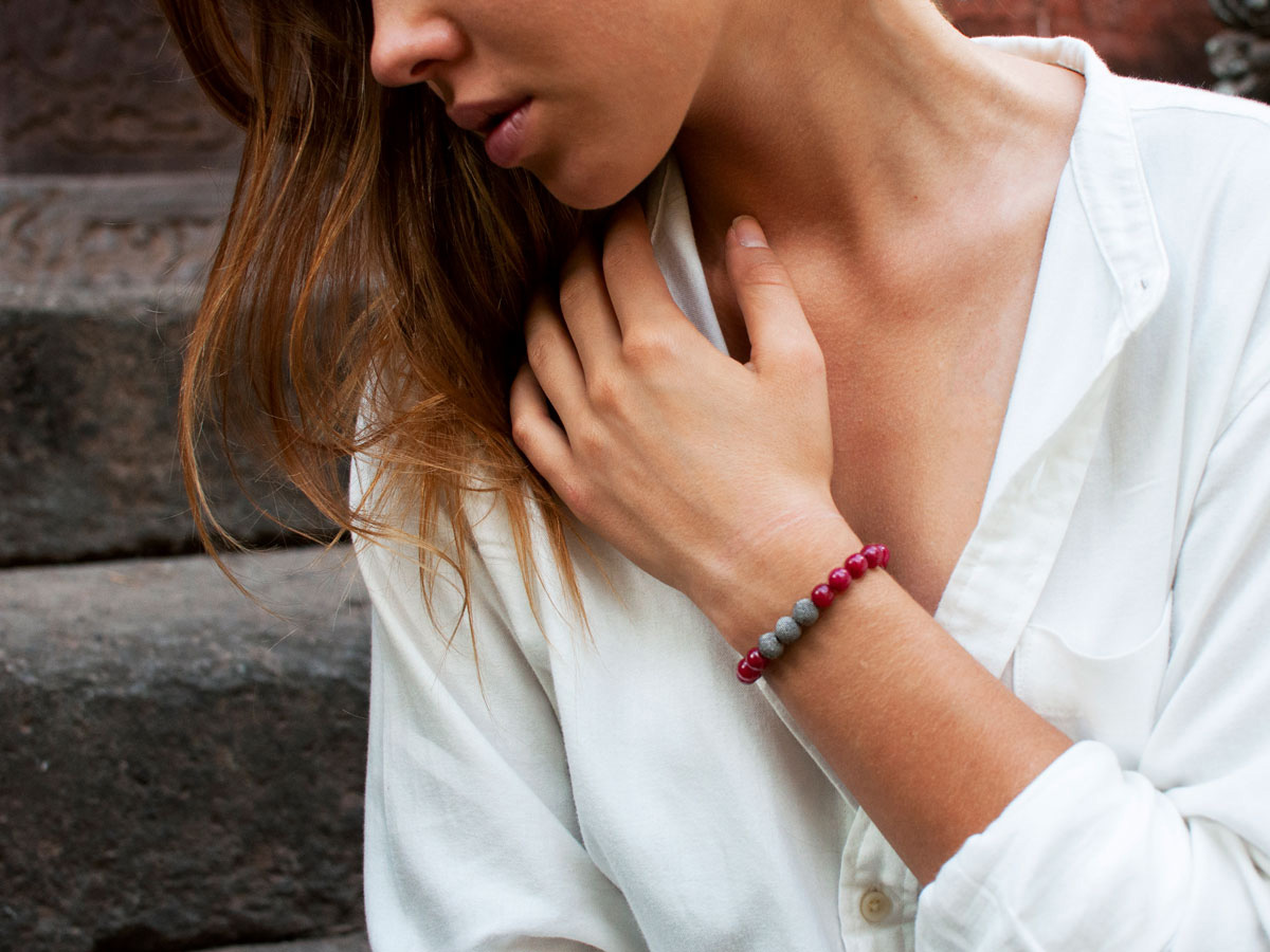 Rubin ist der Inbegriff der Farbe Rot in der Welt der Edelsteine und wird vor allem für seinen strahlend roten Farbton begehrt, sein Glanz ist diamant- bis seidenartig. Dabei wird ausschließlich das rote Mineral des Korund als Rubin bezeichnet, denn schon ein rosafarbener oder blauer Korund gilt als Saphir. Die Rubin Perlen wurden für ein gleichbleibendes Farbbild erhitzt. Man spricht hierbei von “Heat Treatment”. Rubin ist einer der stärksten Steine, wenn es um Liebe und Sexualität geht, denn seine Wirkung ist vitalisierend und dynamisch. Durch ihn kehren Wünsche und Sehnsüchte in den Alltag zurück und der Mut zum Ausleben selbiger wird stärker. Sexuelle Probleme können durch ihn aufgelöst werden und er verleiht Lebenskraft, Hingabe  und Entschlossenheit. Er unterstützt uns, die eigenen Wünsche und Bedürfnisse zu entfalten, dabei aber Grenzen des Partners sowie die eigenen auszuloten und zu respektieren.