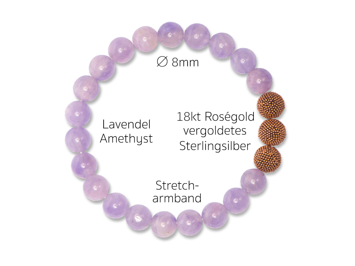 Feminine und farbliche Akzente setzt das zweifarbige Damenarmband aus exklusive Lavendel Amethyst in 8 mm. Die in 18 kt Roségold vergoldeten Silberperlen runden das ästhetische Farbbild ab – unkompliziert schön und minimalistisch für Dein elegantes Statement.