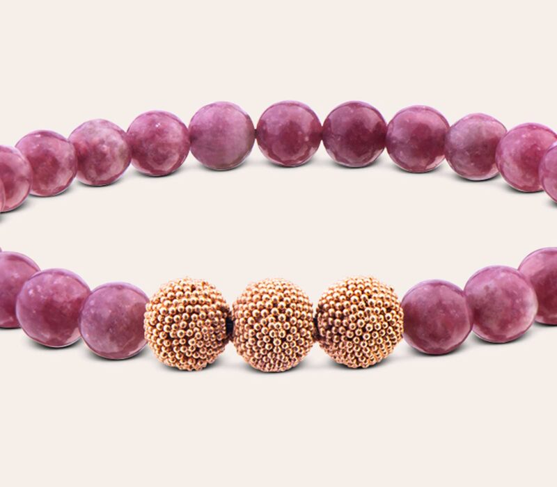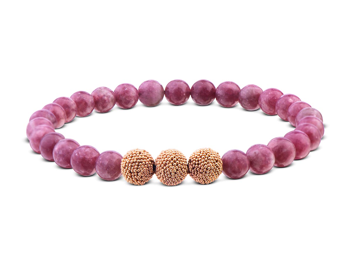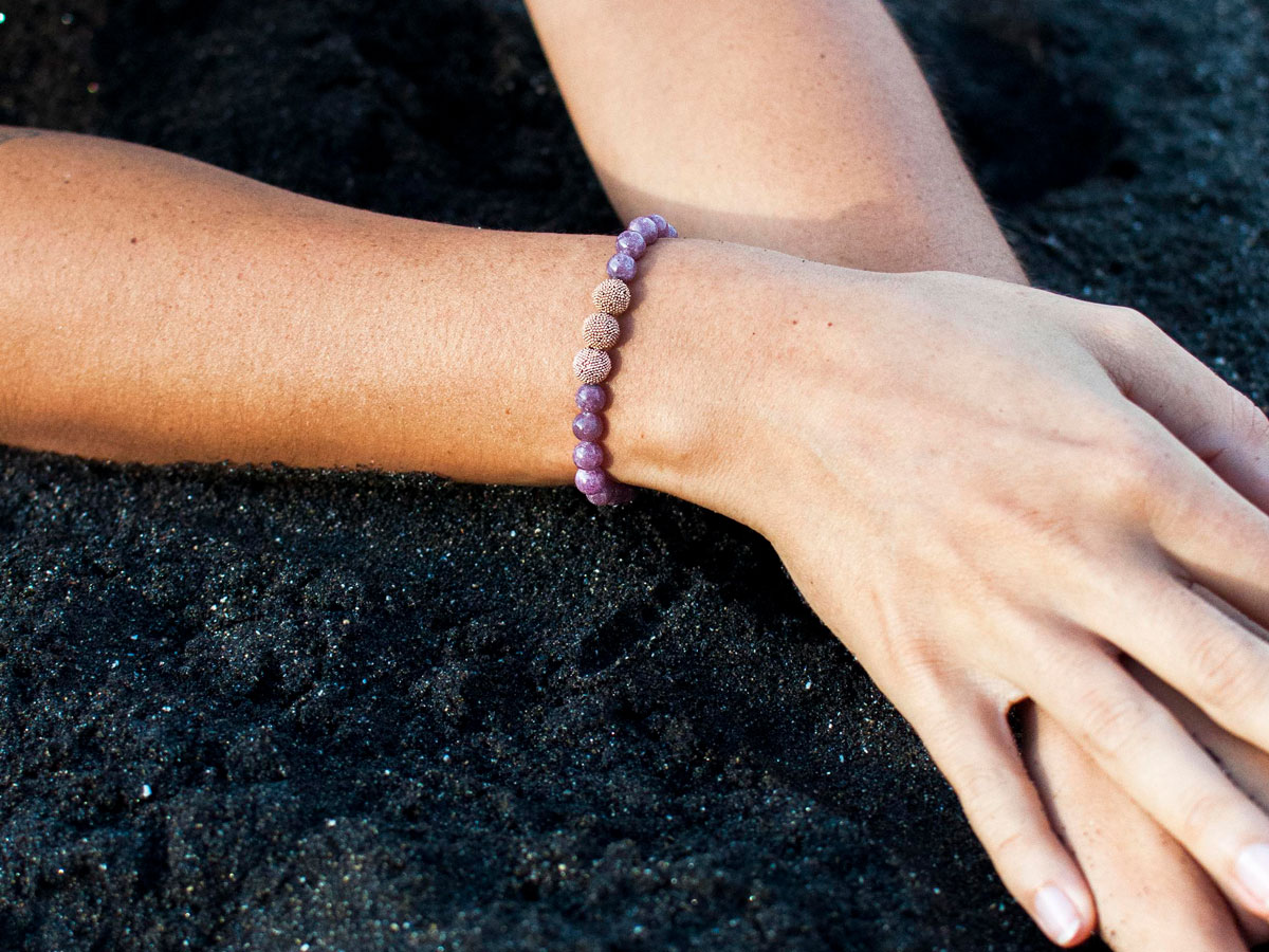Einen femininen Akzent setzt dieses unifarbene Damenarmband mit seinem farbintensives Design. Lepidolith Beads in 6 mm in ihrem kräftigen Violett bilden mit den in edlem Roségold vergoldeten Silberperlen eine strahlende Symbiose. Diese Harmonie verleiht Deinem Style das gewisse Etwas.