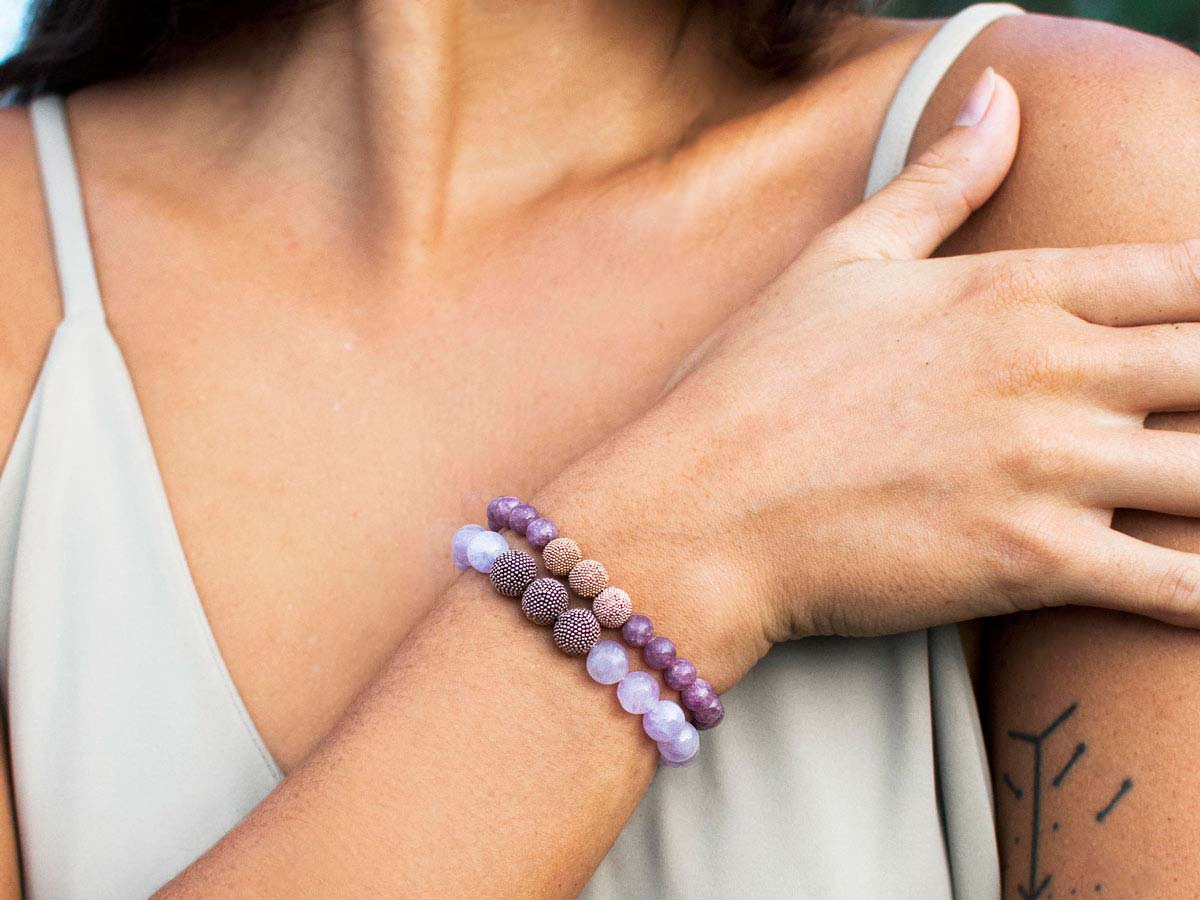 Alle Armbänder werden auf einem Stretchband aufgefädelt und gleiten so mühelos über Deine Hand. Wir empfehlen beim An- und Ablegen das Armband über den Handrücken zu rollen.