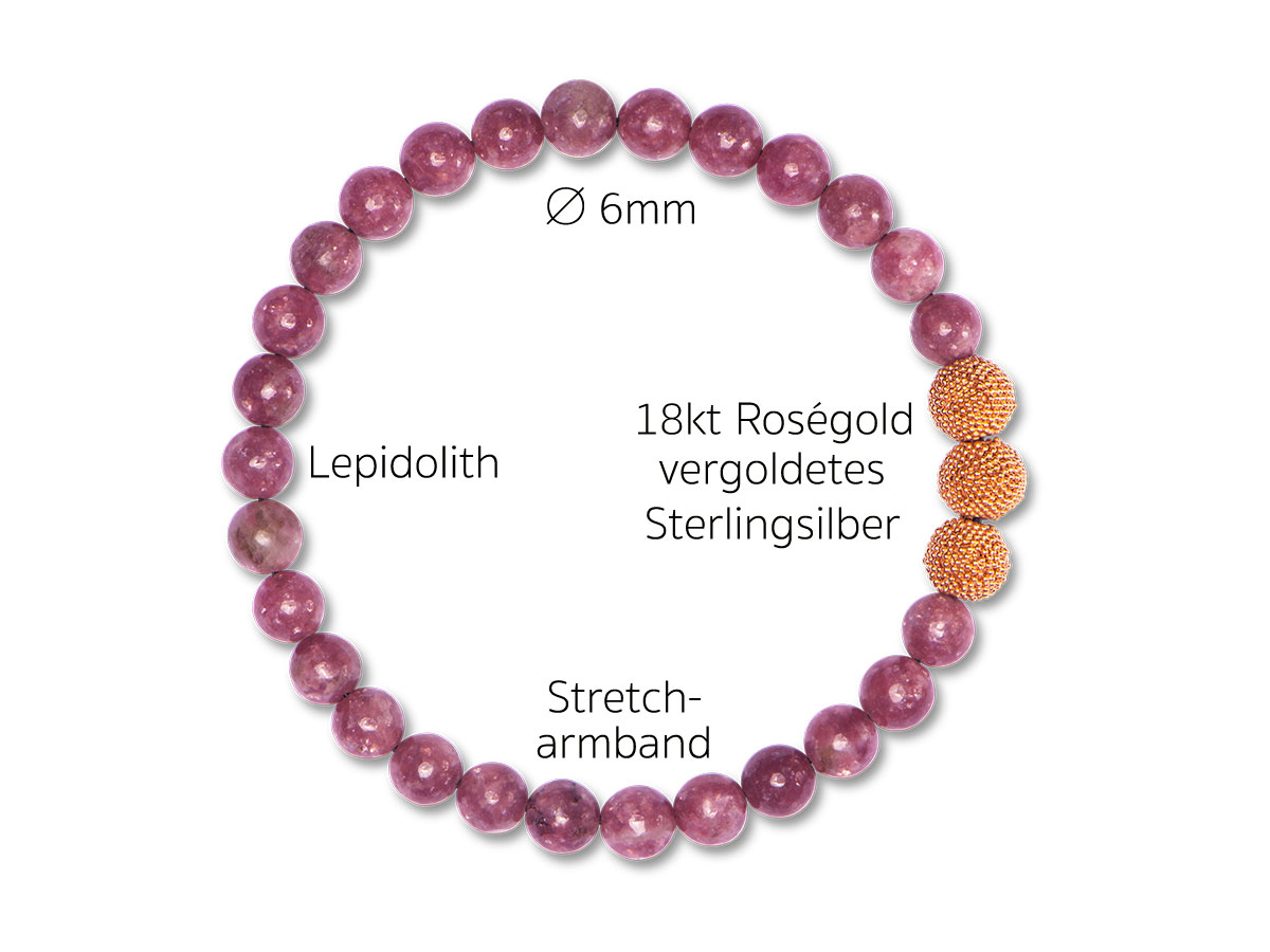 Einen femininen Akzent setzt dieses Damenarmband mit seinem farbintensiven Look. Die 6 mm Lepidolith Beads in ihrem kräftigen Violett bilden mit den in edlem Roségold vergoldeten Silberperlen eine strahlende Symbiose. Diese Harmonie verleiht Deinem Style das gewisse Etwas für Deinen modischen Alltag.