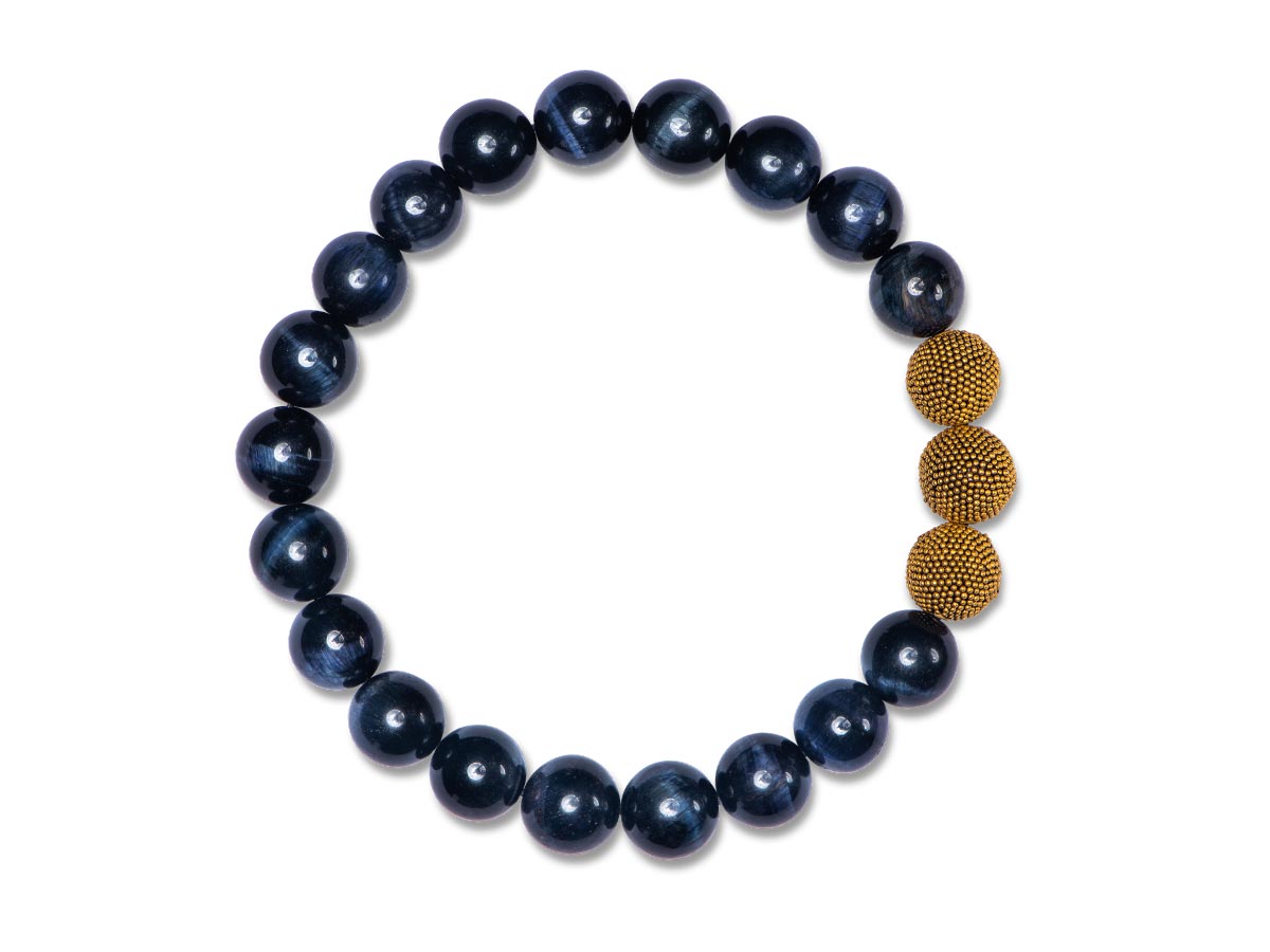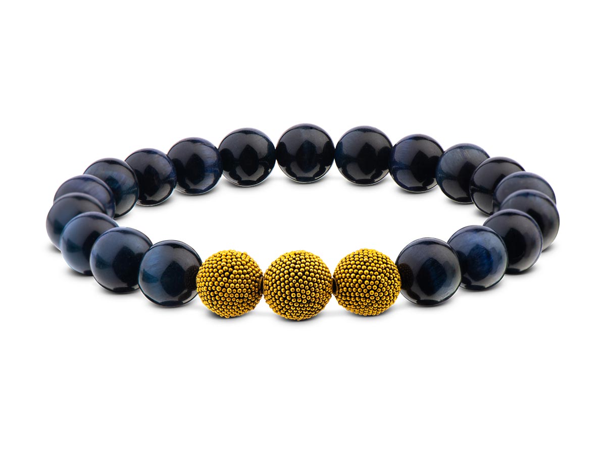Unser elegantes Herrenarmband aus nachtblauem Tigerauge mit den markanten 10 mm Beads besticht durch die ruhige Harmonie mit den vergoldeten & mattierten Silberperlen - Dein Eyecatcher für den stilvollen Alltag.
