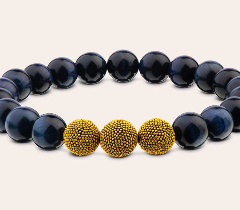 Unser elegantes Herrenarmband aus nachtblauem Tigerauge aus markanten 10 mm Beads besticht durch die ruhige Harmonie mit den vergoldeten & mattierten Silberperlen – Dein Eyecatcher für den stilvollen Alltag.