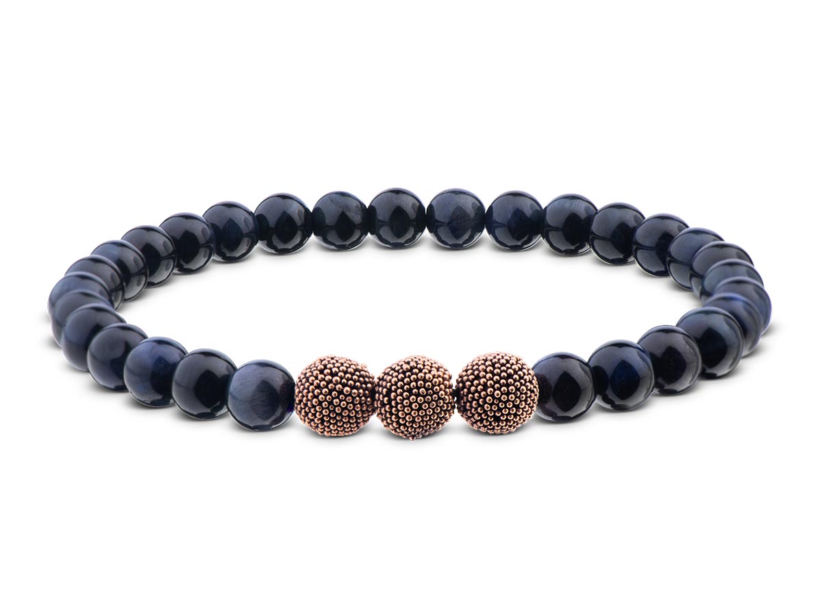 Schlichte Eleganz bietet die stilvolle Symbiose aus blauem Tigerauge in 6 mm und dem edlen Roségold der matt vergoldeten Jawan Beads. Dieses Herrenarmband wird zum dezenten Eyecatcher Deines Outfits - ganz gleich ob modischer Look oder Business Outfit.
