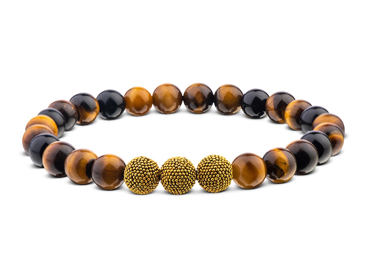 Dieses Herrenarmband biete einen stylischen Mix aus den warme Brauntönen des Tigerauges (8 mm) kombiniert mit Onyx und dem sanften Goldton der vergoldeten & mattierten Silberperlen.  Optisch ästhetisch und stilvoll abgerundet als dezentes Highlight für Deine legeren Styles.