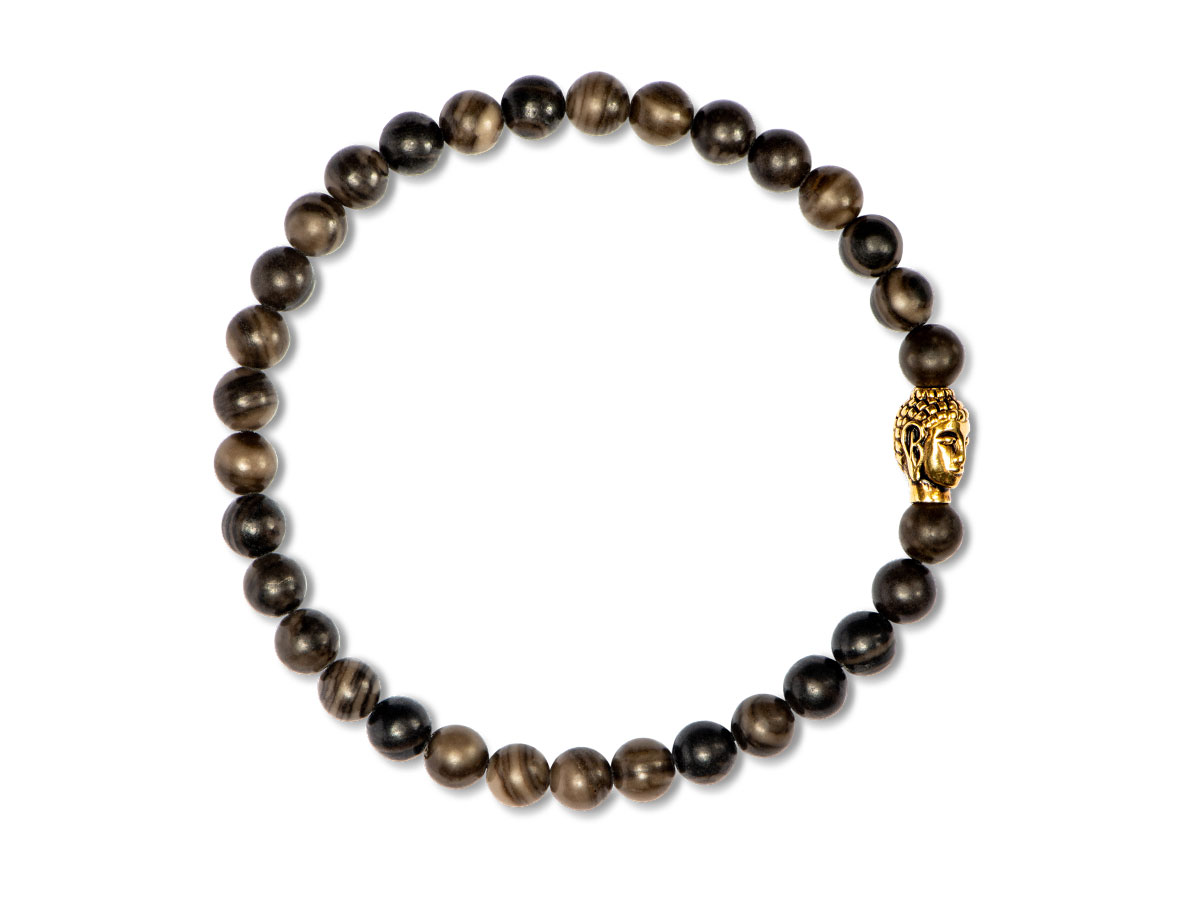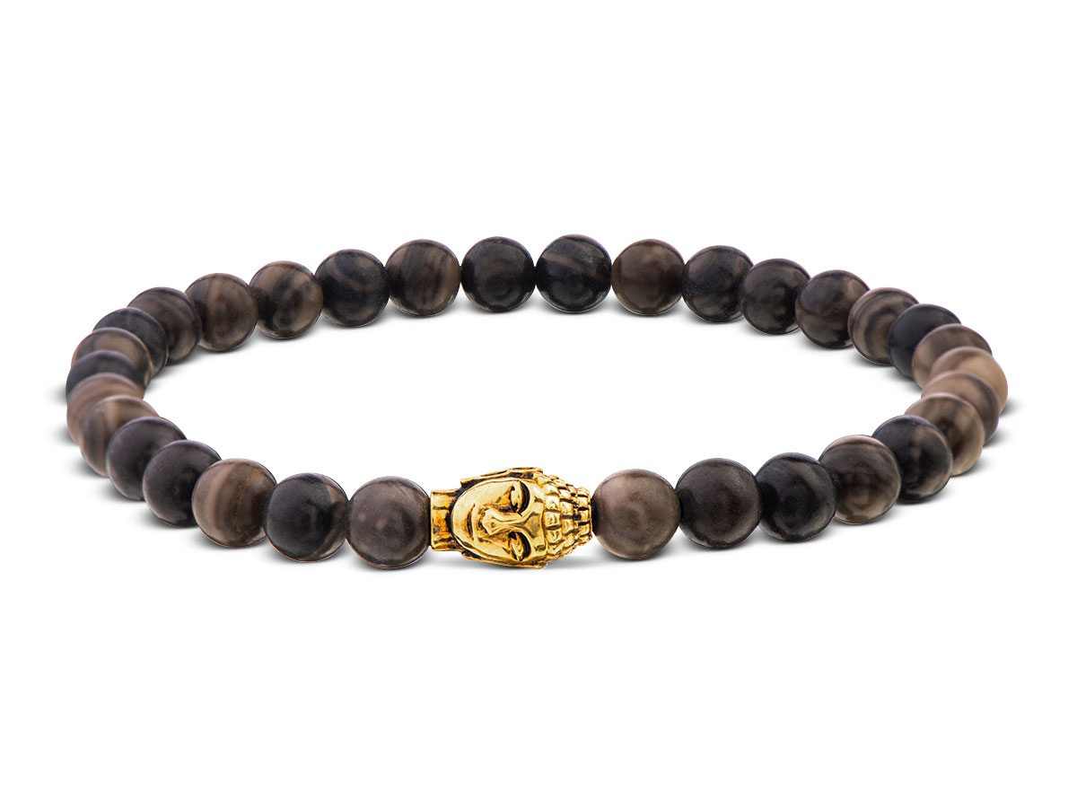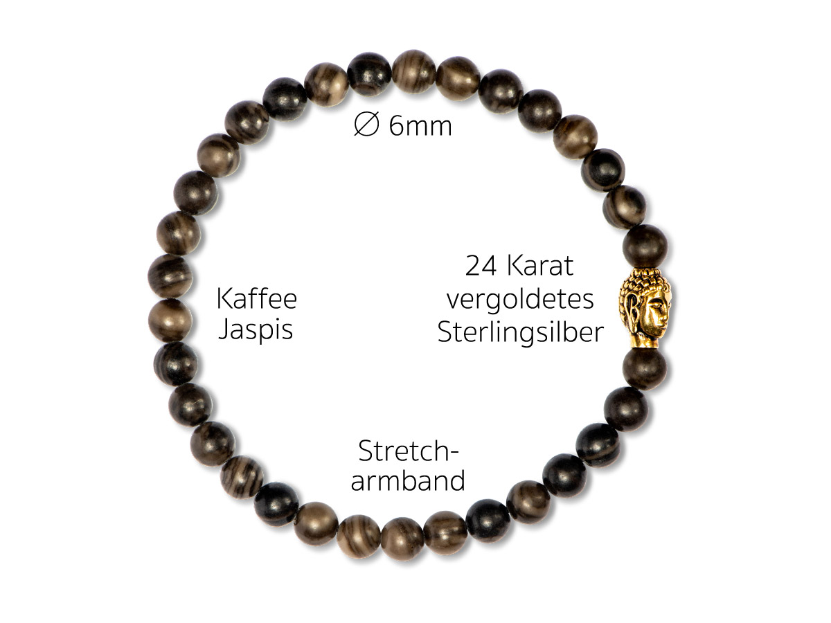Das coole Design aus mokkabraunem Kaffee Jaspis in 6 mm mit vergoldetem Buddhakopf verleiht diesem Armband seine modische Note und kreiert einen betont legeren Look.