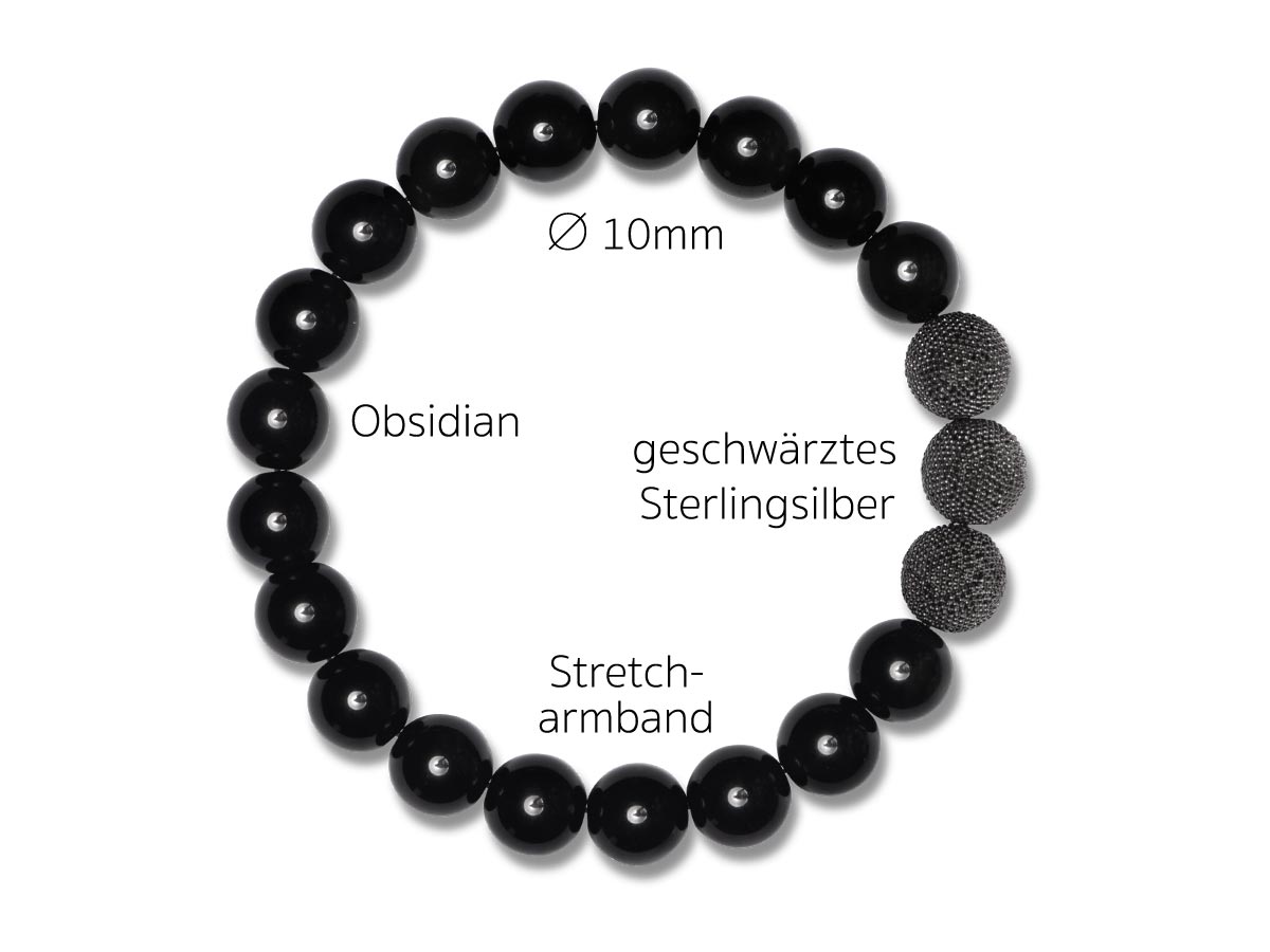 Obsidian Ø 10mm mit handgefertigten Silberperlen in Black Rhodium vergoldet