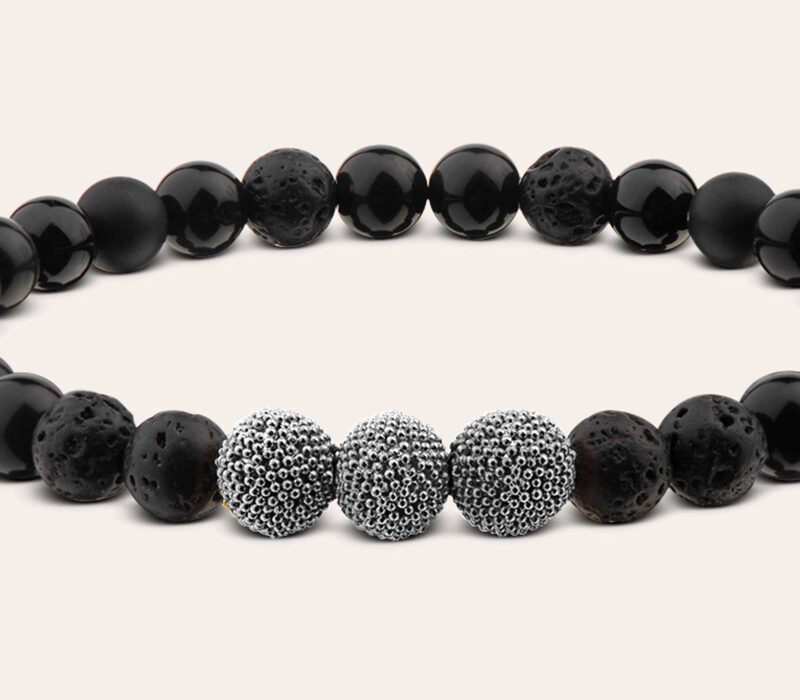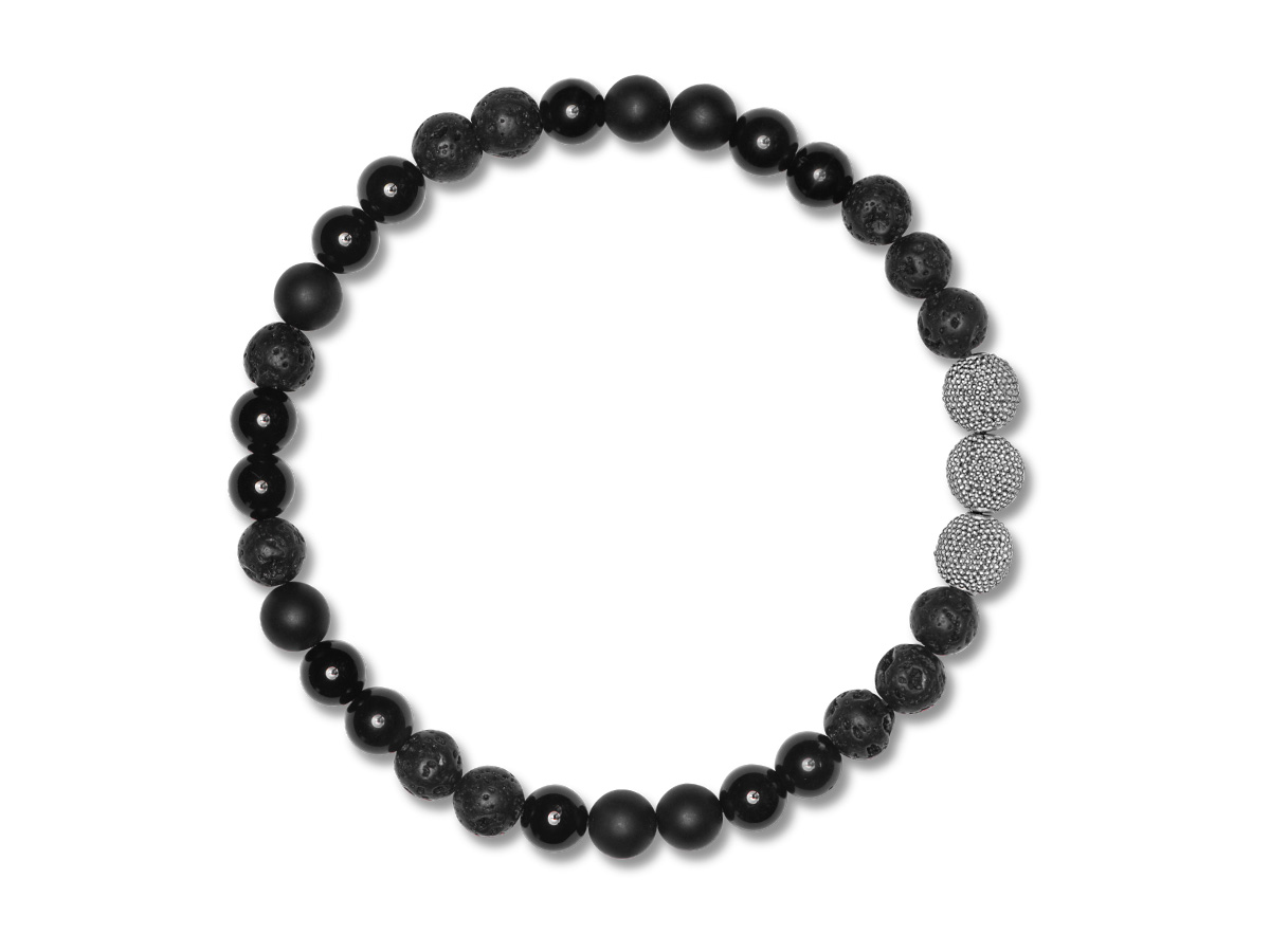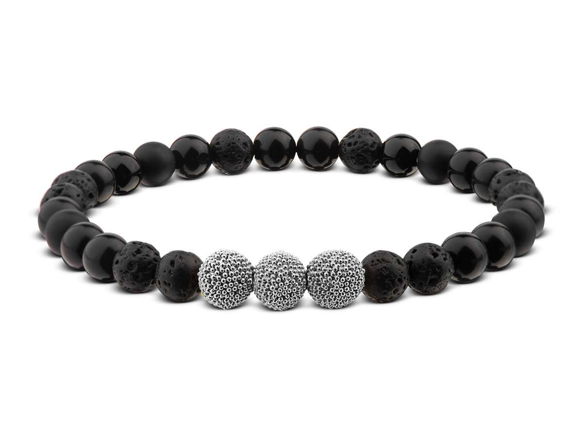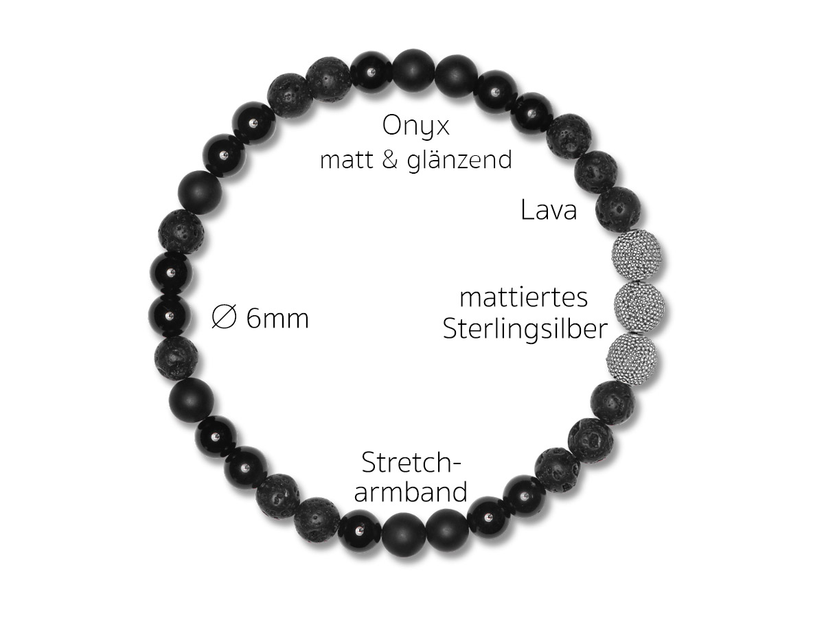 Minimalistisches Design für einen markanten Look schafft dieses Herrenarmband aus 6 mm Onyx (matt & glänzend) und Lava Beads., elegant abgerundet mit filigranen Silberperlen für einen edlen Blickfang am Handgelenk.