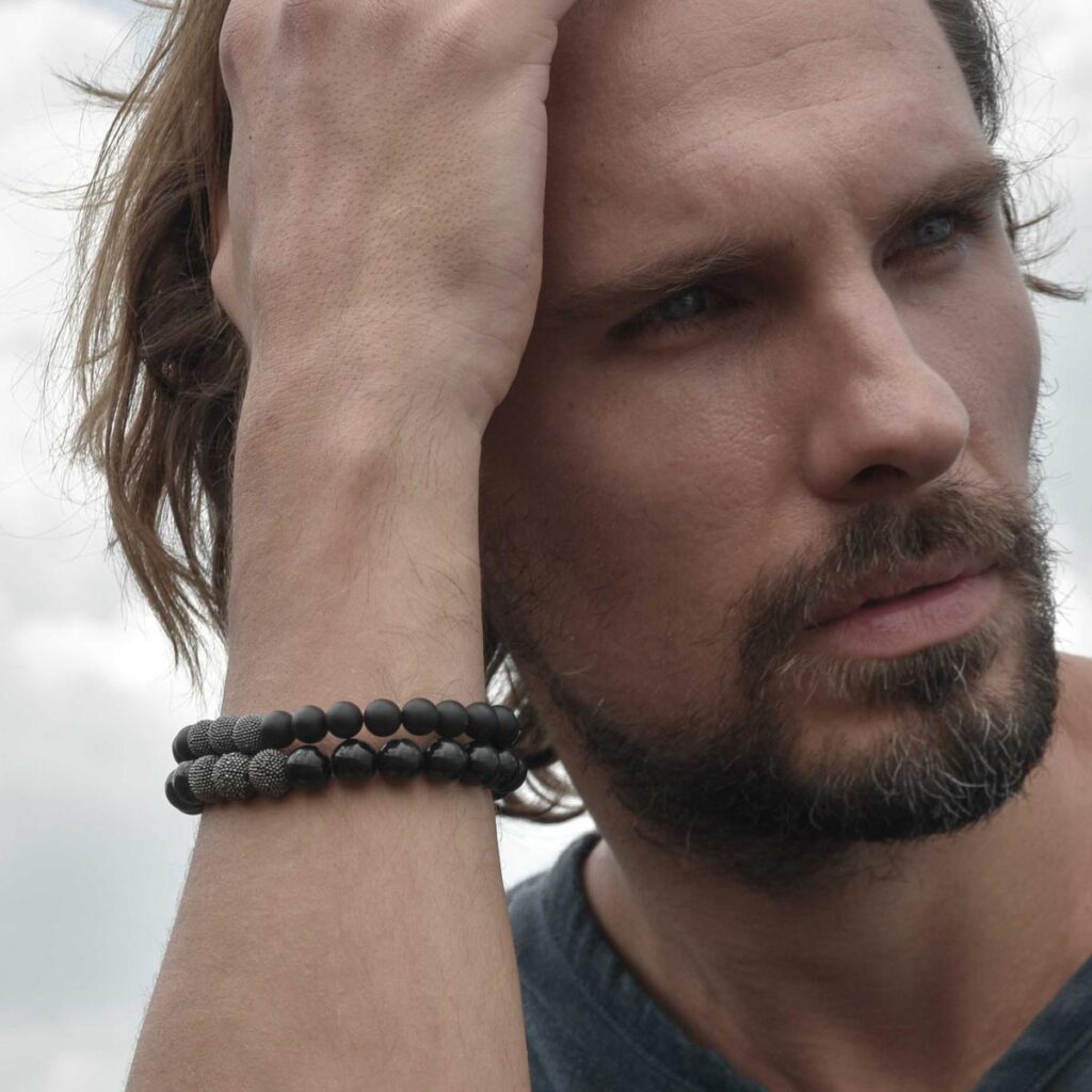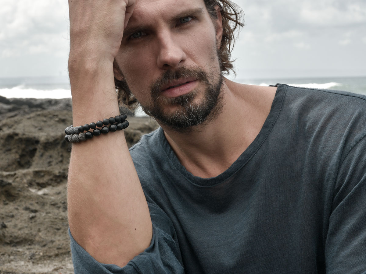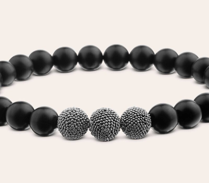Ein betont minimalistischer Stil prägt dieses schwarze Herrenarmband, erzielt durch die Kombination aus mattierten Onyx in 8 mm und geschwärzten Jawan Beads, passend zu Business Looks oder legeren Outfits.