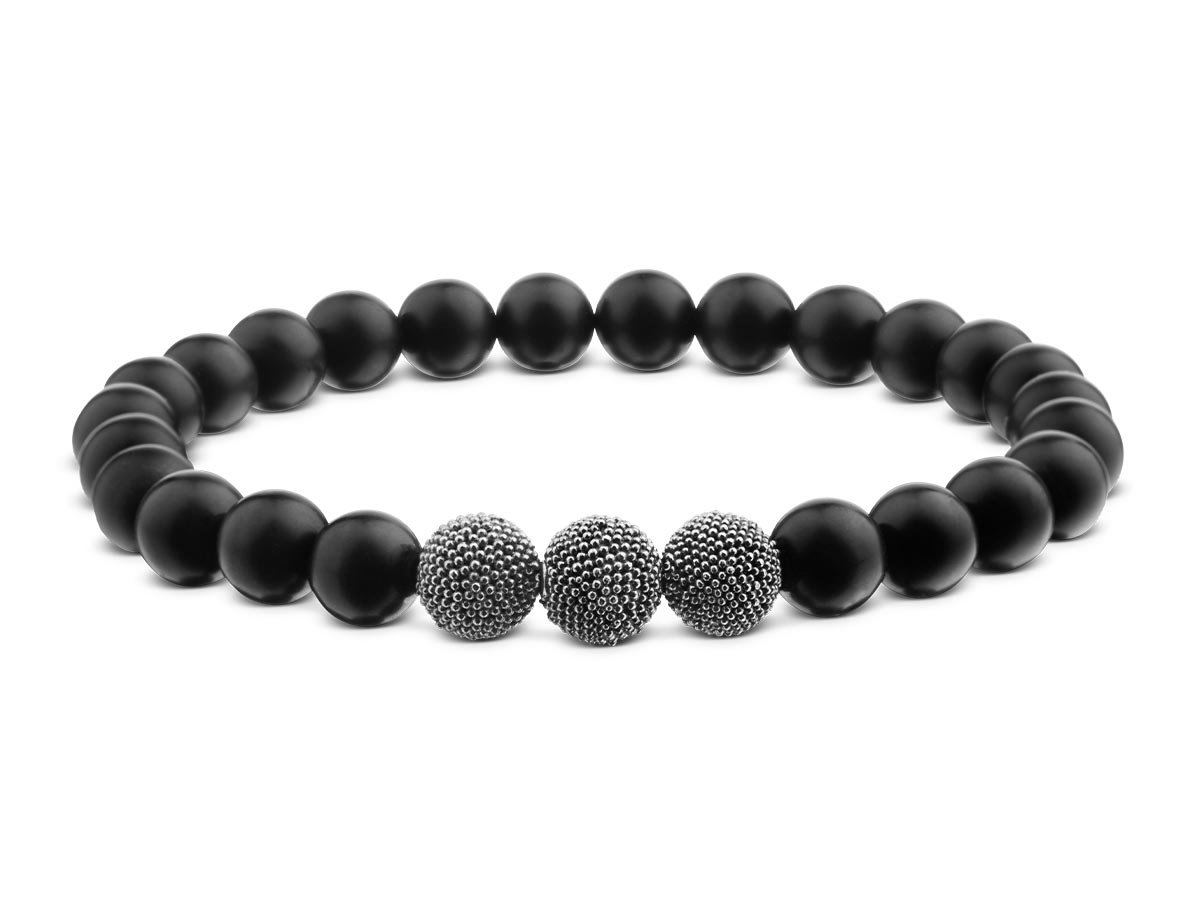 Ein betont minimalistischer Stil prägt dieses schwarze Herrenarmband, erzielt durch die Kombination aus mattierten Onyx in 8 mm und geschwärzten Silberperlen, passend zum Business Look oder legeren Outfits.