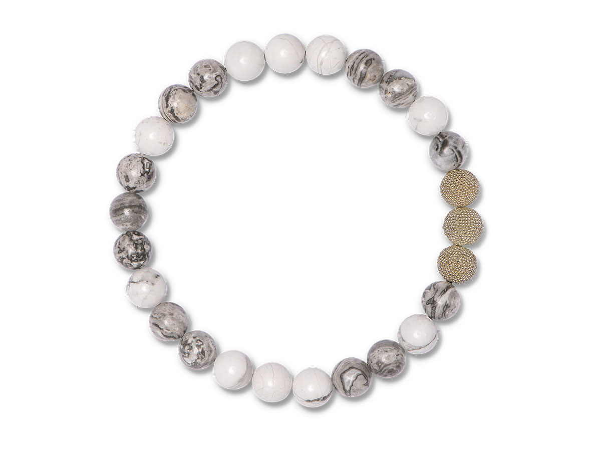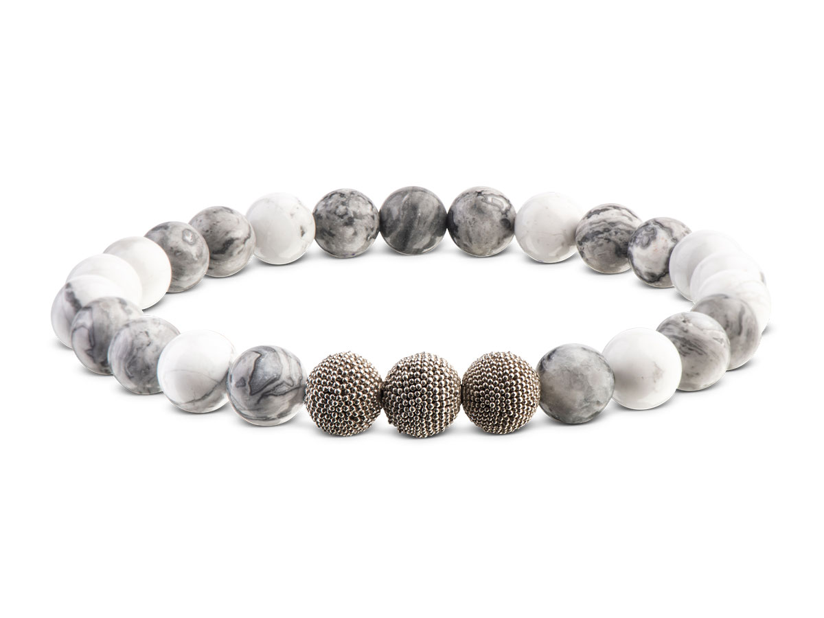 Der klassische Farbmix Weiß & Grau, aus Howlith und Picasso Jaspis in 8 mm, verleiht mit den handgefertigten Jawan Beads eine zeitlos-elegante Ausstrahlung.