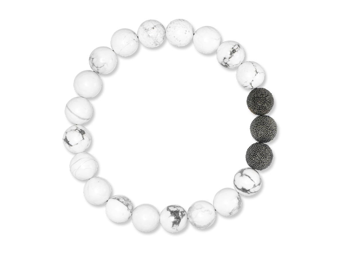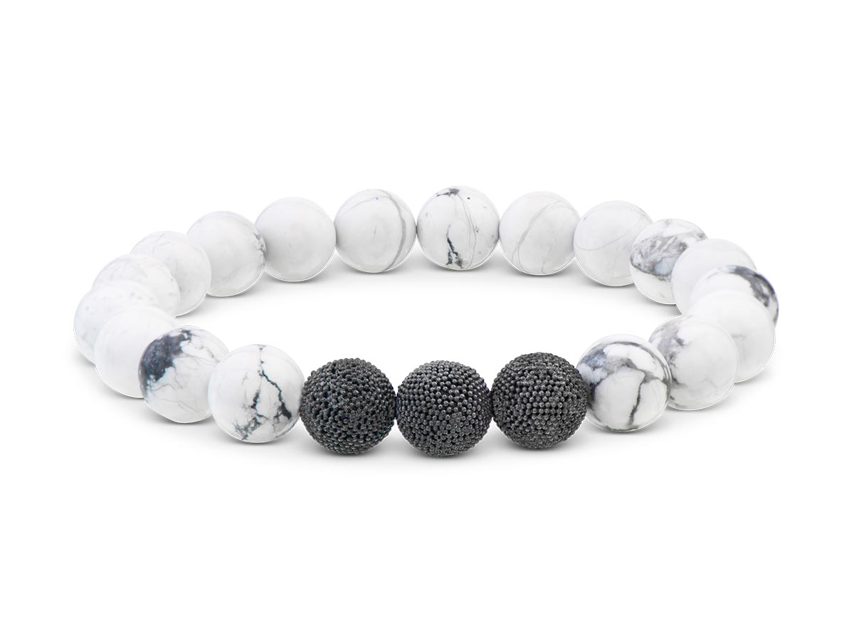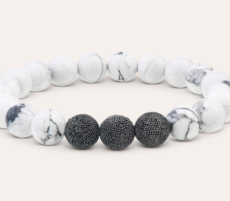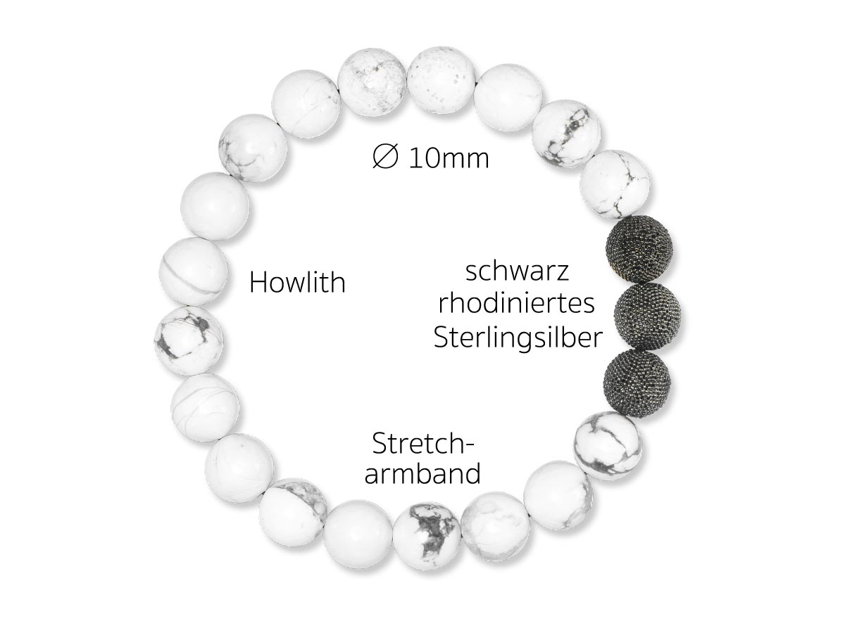Weißer Howlith Ø 10mm mit handgefertigten Silberperlen in Black Rhodium vergoldet