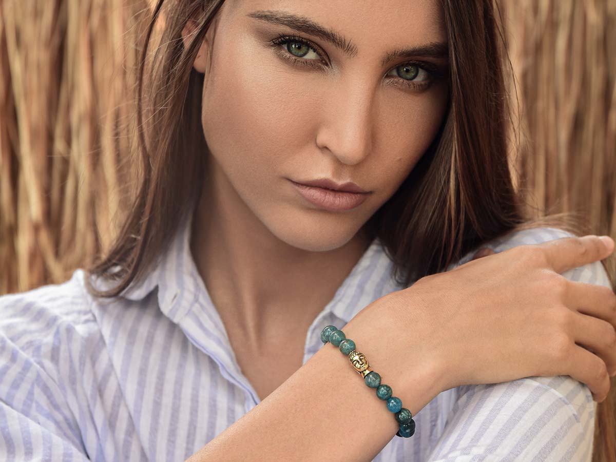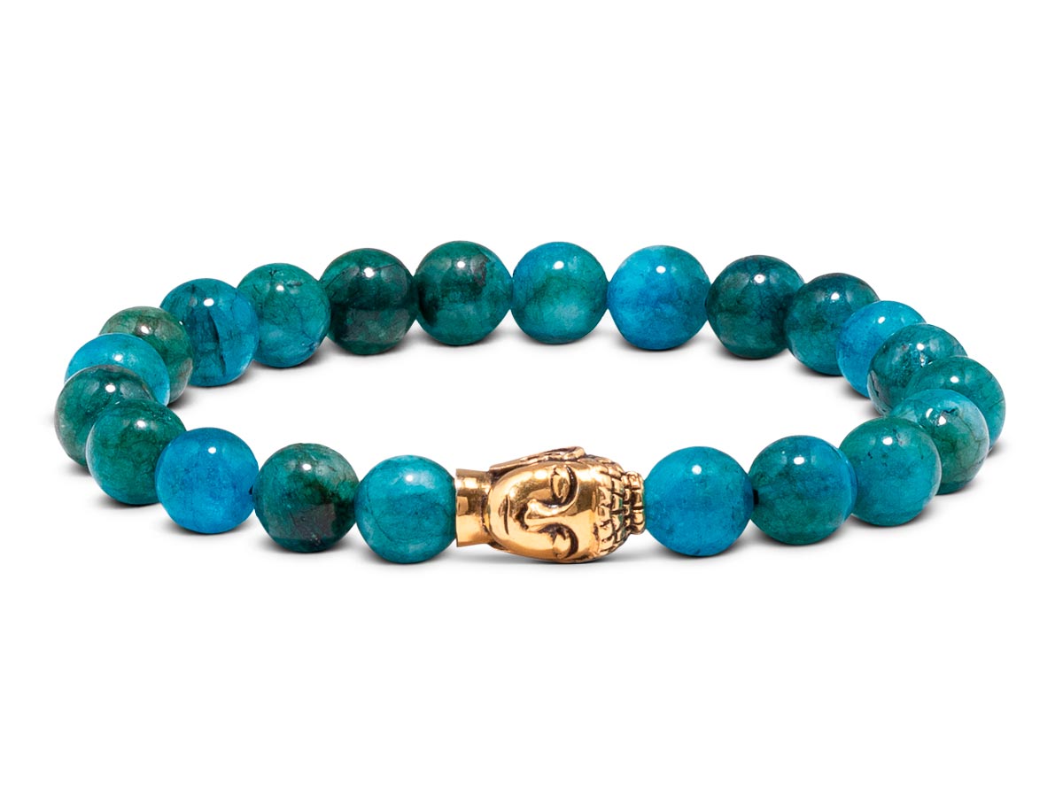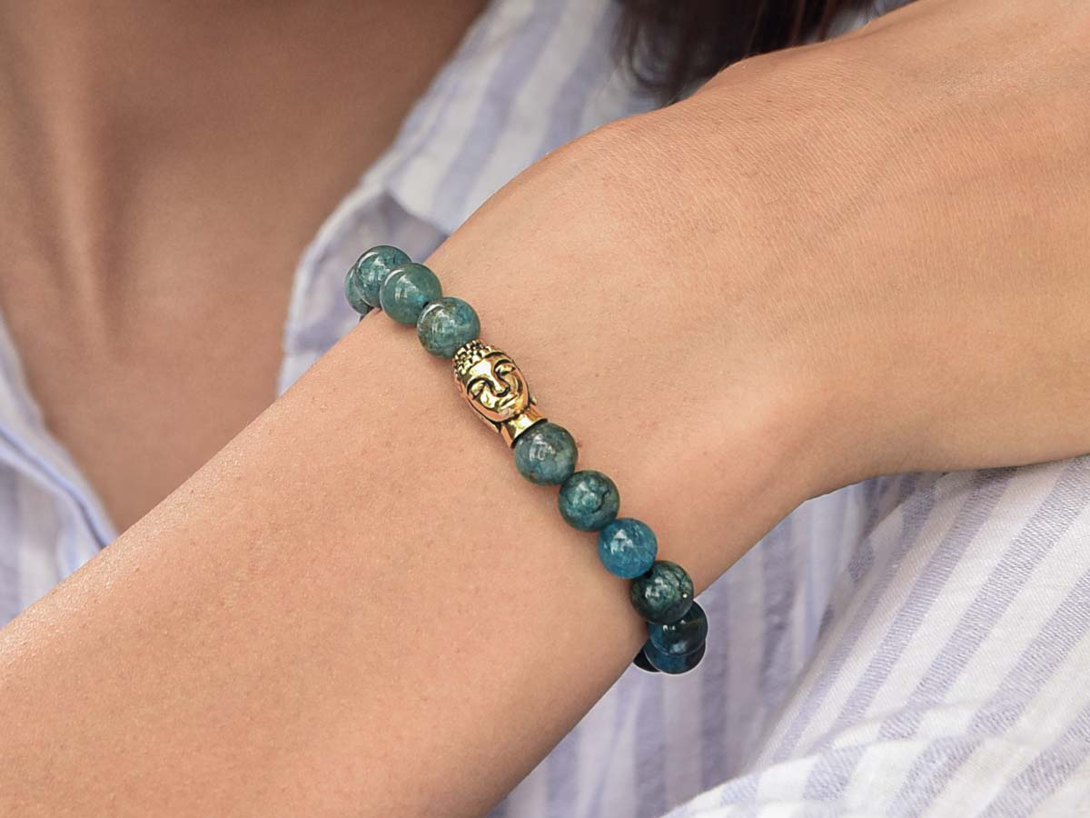 Blauer Apatit besticht durch seine atemberaubenden Farbnuancen aus unterschiedlichen Blautönen von sehr hell bis Dunkelblau bis hin zu Türkis. Das blau-grüne Mineral mobilisiert Energiereserven und stärkt die Eigenständigkeit, um so Lustlosigkeit und Routine hinter sich zu lassen und mit mehr Offenheit auf andere zuzugehen. Die Komposition aus intensiven Blautönen wird durch den vergoldeten Buddha aus Sterlingsilber perfekt abgerundet und erzeugt ein elegantes Damenarband, mit dem Du nahezu jedem Deiner Outfits das besondere Etwas verleihen kannst.