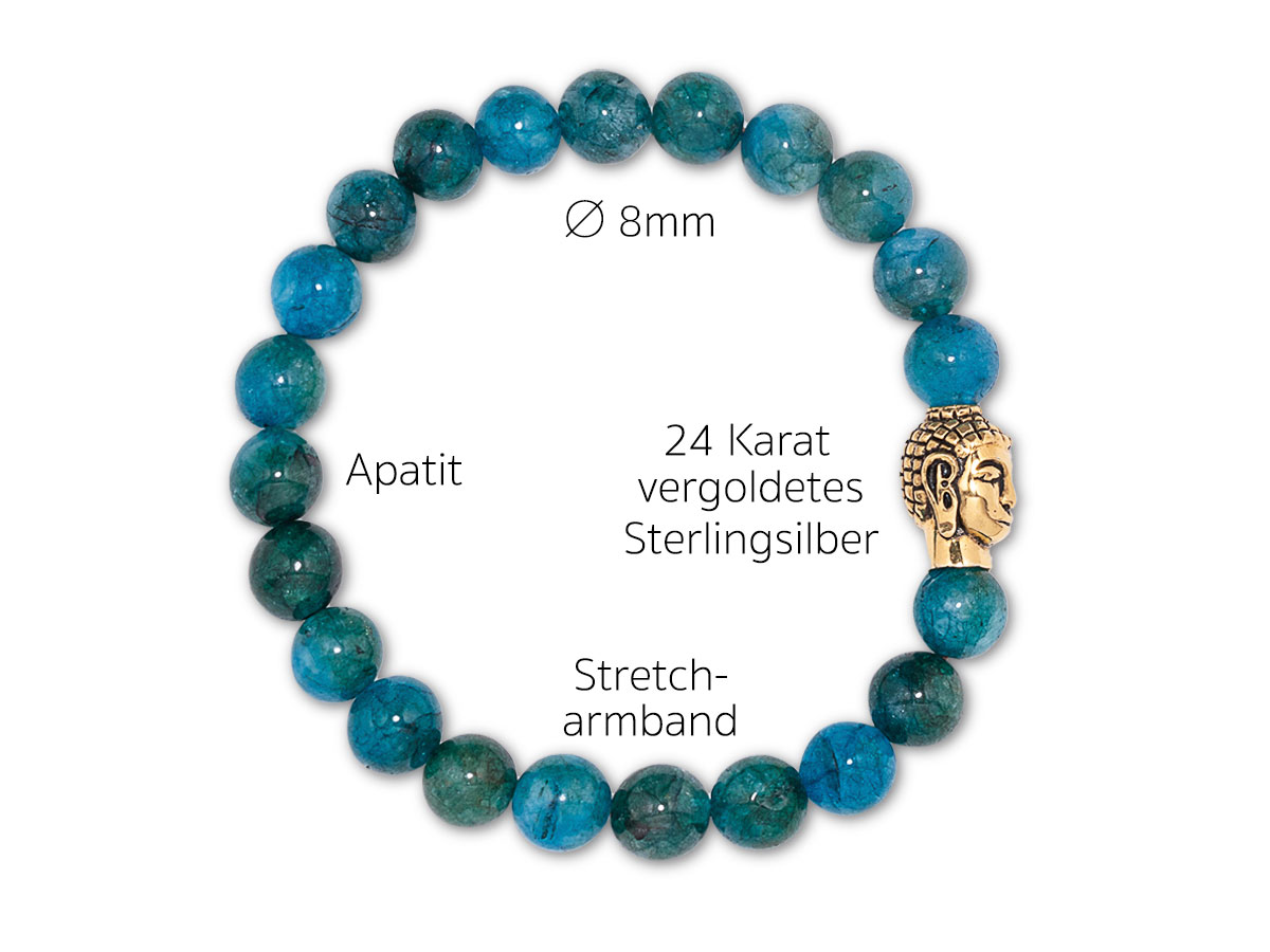 Apatit Ø 8mm mit Silber Buddha in 24kt matt vergoldet