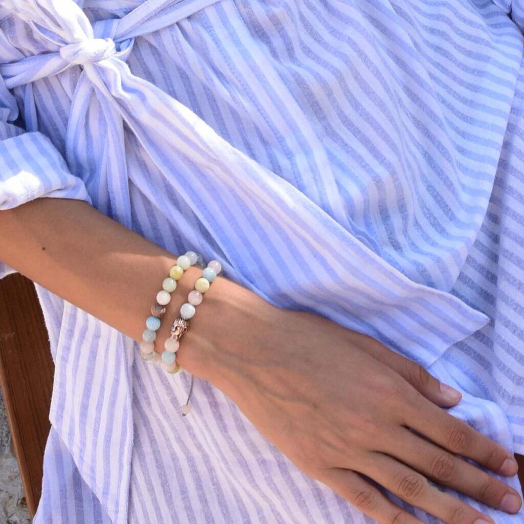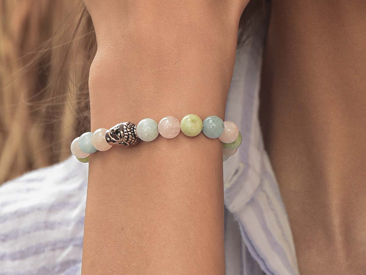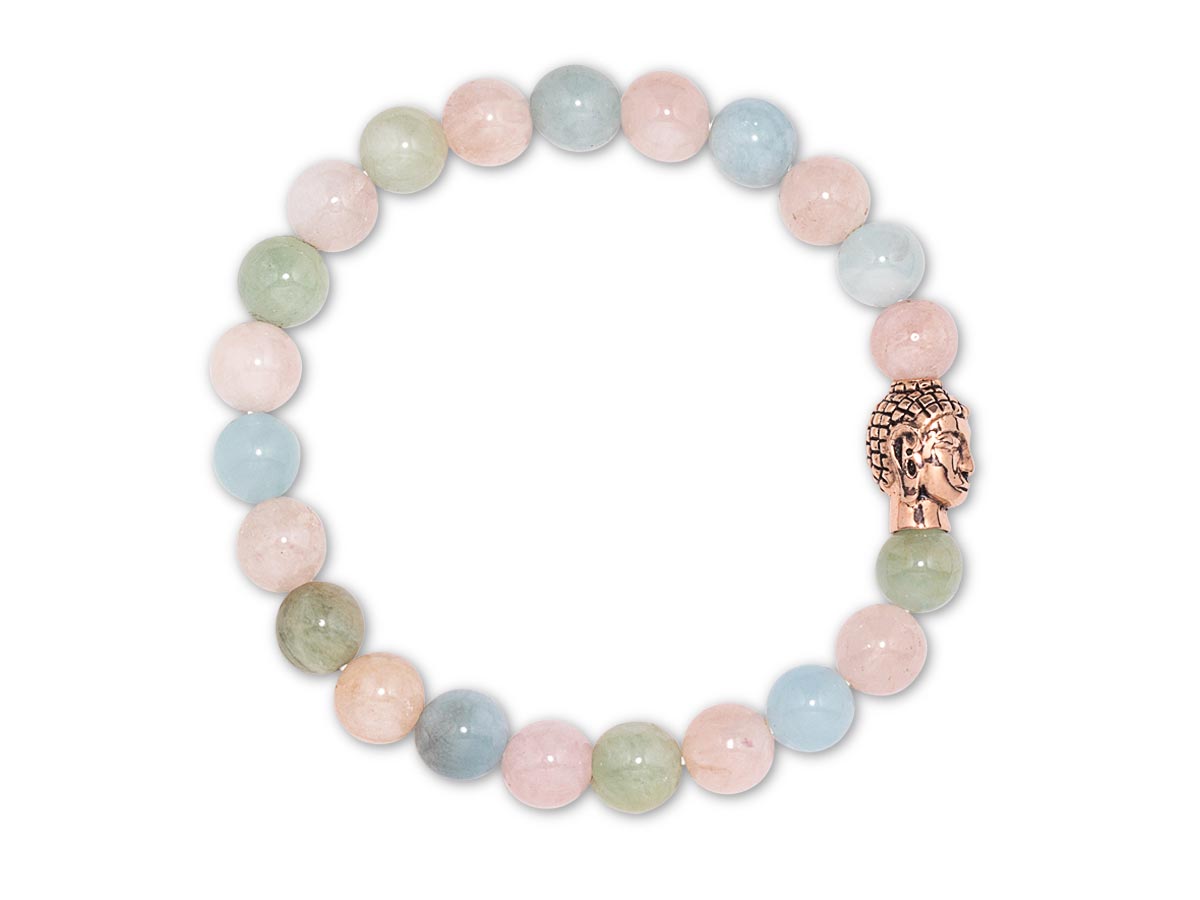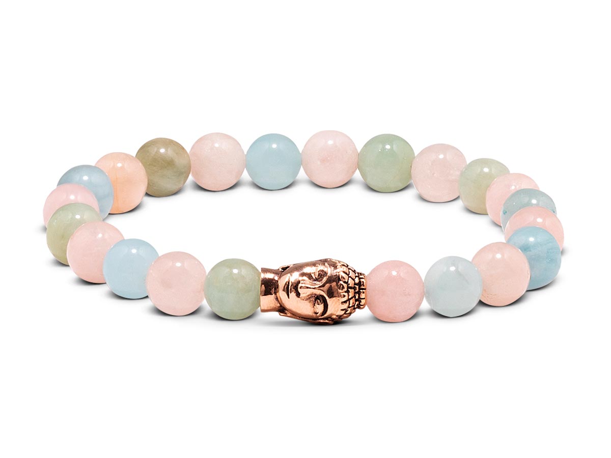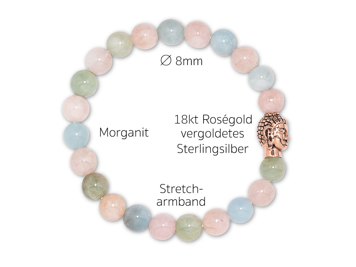 Morganit zeichnet sich durch seine feinen Pastelltöne und einen glasigen Glanz aus. Die Farbskala reicht von pfirsich und rosa über Hellblau bis zu weiß-grau und lindgrün. Dabei ist er ein echter Stresshelfer, denn er verleiht Ausgeglichenheit, lindert Ängste und Stress, da er sich positiv auf das Nervensystem auswirkt. Mit seiner femininen Farbkomposition harmonieren die 8 mm Perlen perfekt mit dem in 18kt Roségold vergoldeten Buddha aus Sterlingsilber und schaffen so für Dich einen gelassenen Begleiter am Handgelenk, der Deinen femininen Look gekonnt unterstreichen wird.