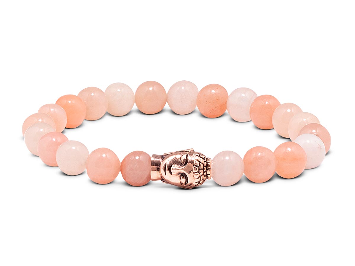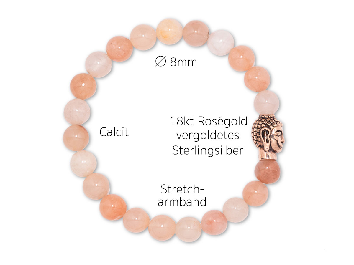 Orangencalcit hat eine leicht durchscheinende Oberfläche, die seine Schönheit nur noch verstärkt. Der natürliche Glanz in Pastell-Orange- und Lachsnuancen wird ergänzt durch leicht milchige Einschlüsse und macht ihn wörtlich zum Eye-Candy. Schon bei den alten Ägypter symbolisiert der farbenfrohe Stein Macht und Reichtum. Orangencalcit fördert durch seine leuchtende Farbe Lebensfreude, stärkt die Selbstachtung und verleiht Selbstvertrauen. Für dieses elegante Damenarmband verwenden wir 8 mm Perlen zusammen mit dem Roségold vergoldeten Silber Buddha, das an Deinem Handgelenk zum edlen Blickfang avanciert.
