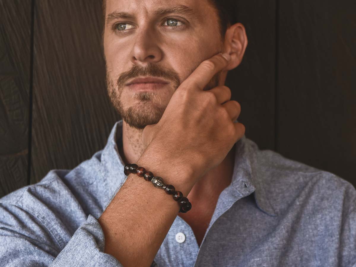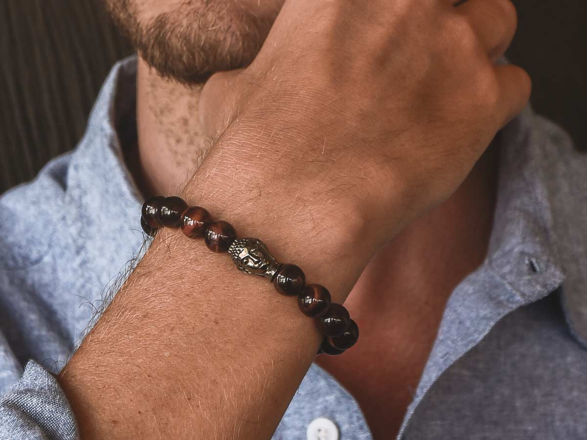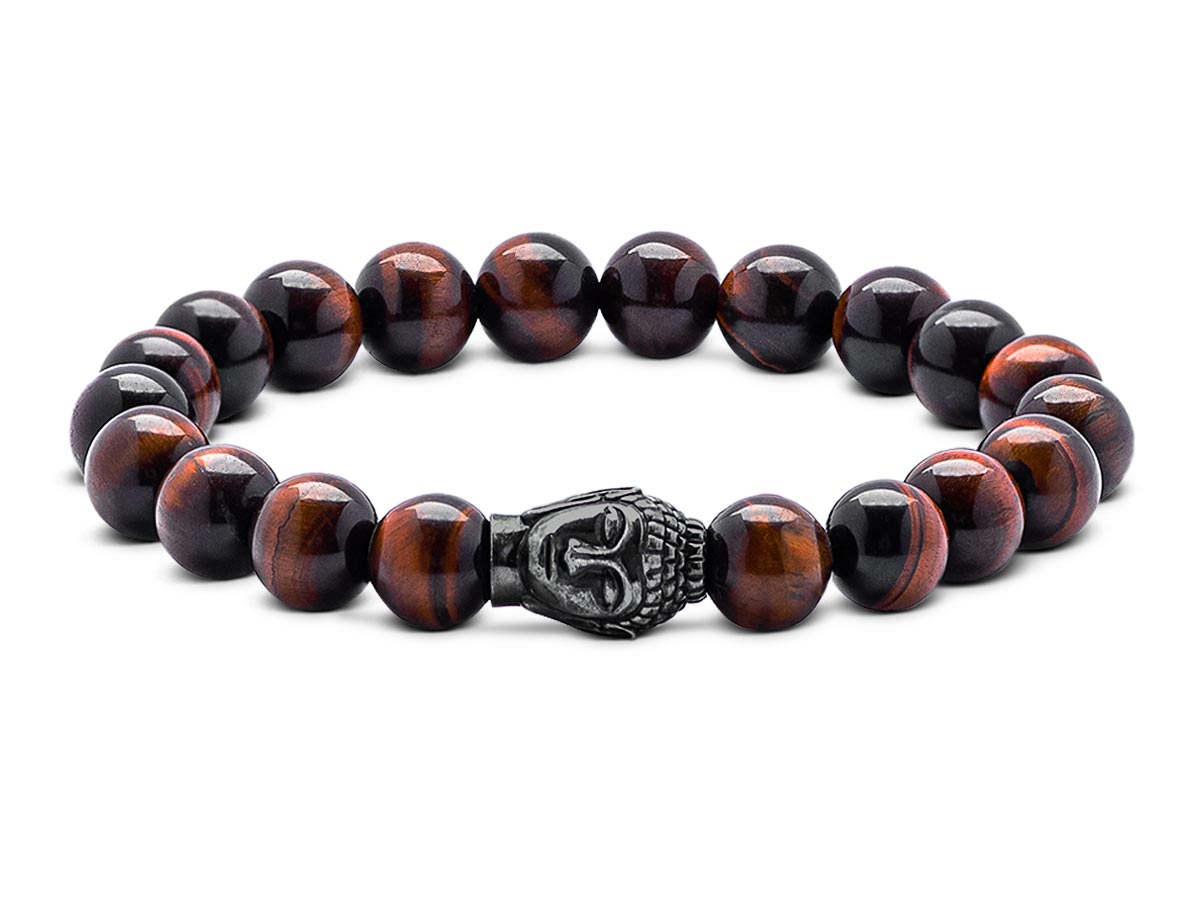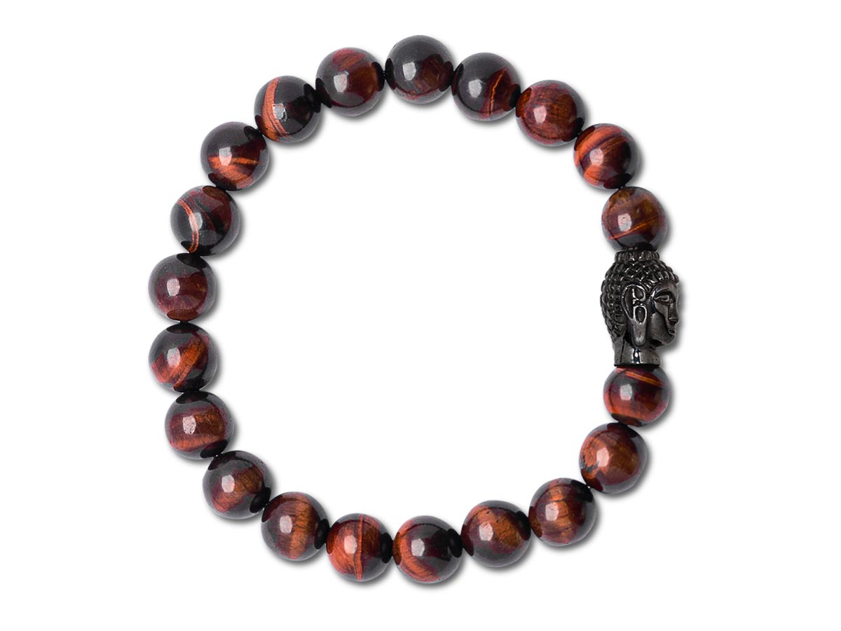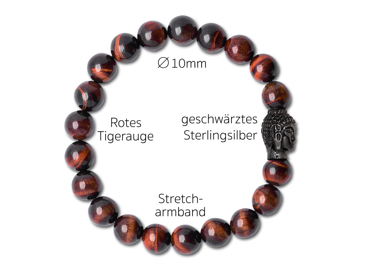 Rotes Tigerauge schimmert in dunklem Lehmrot und ist von helleren wie dunkleren, rotbraunen Schlieren durchzogen, so dass die Farben je nach Lichteinfall changieren. Ihm wird nachgesagt, dass es die Schwingungsenergie der Erde und der Sonne in sich vereint, dadurch das innere Gleichgewicht fördert und die Verbindung zwischen Geist, Körper und Seele stärkt. Für dieses markante Herrenarmband wurden die 10 mm Perlen mit dem geschwärzten Buddha kombiniert, das an Deinem Handgelenk zum edlen Eyecatcher avanciert.