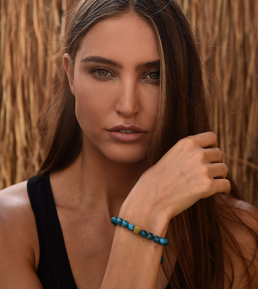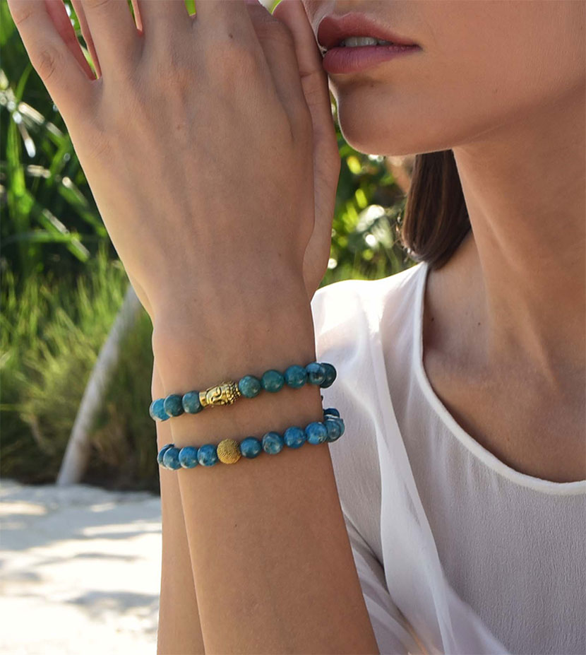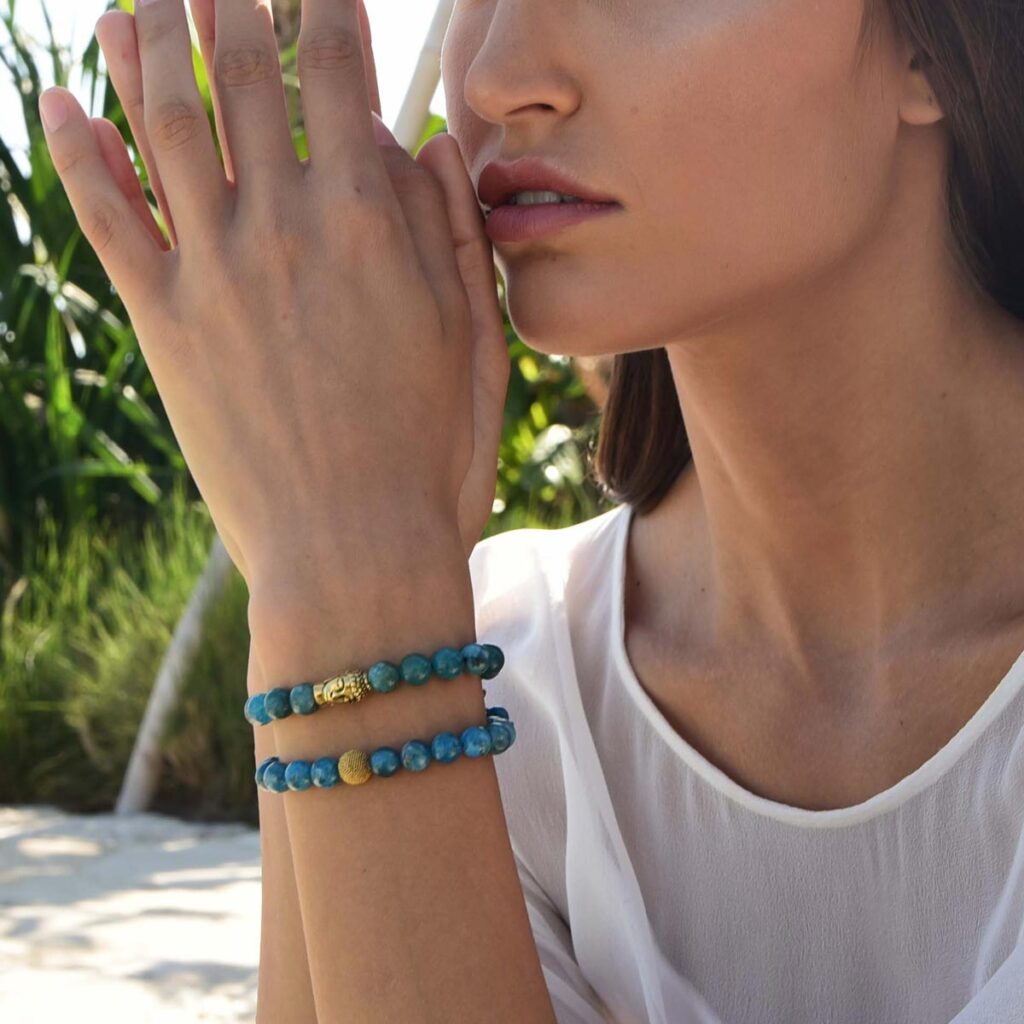 Zeitlos schönes Damen Armband mit Edelsteinperlen aus Apatit & vergoldeter Silberperle handmade in Bali. Stilvolle Eleganz mit einem Hauch von Luxus