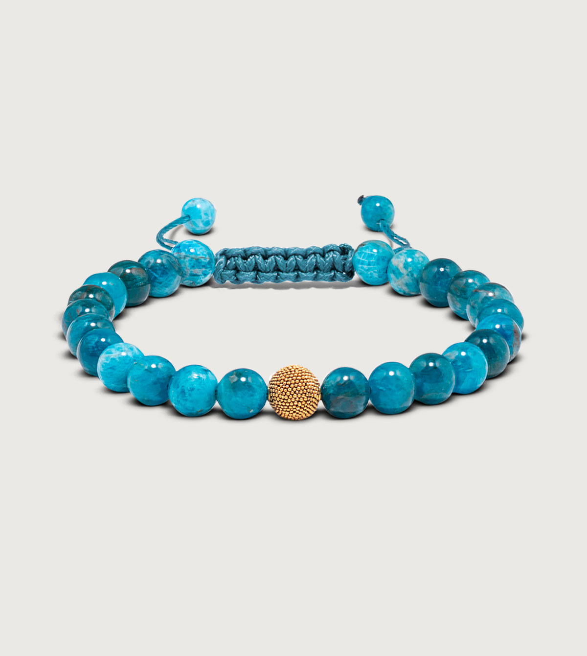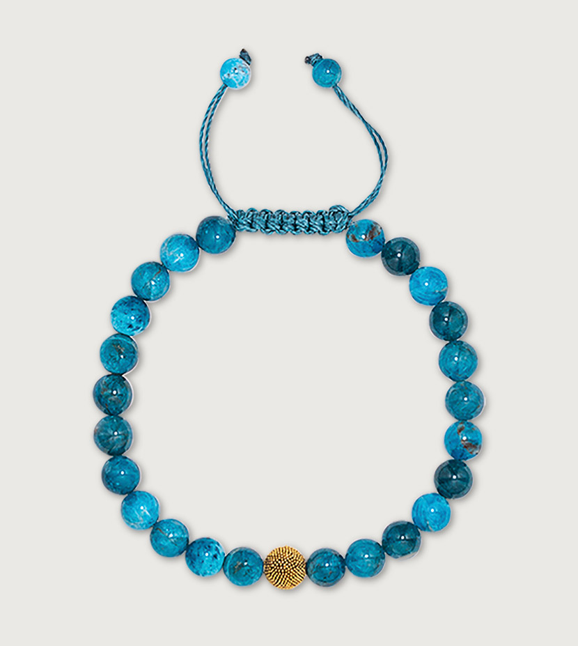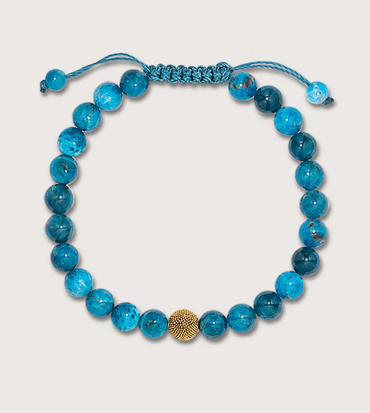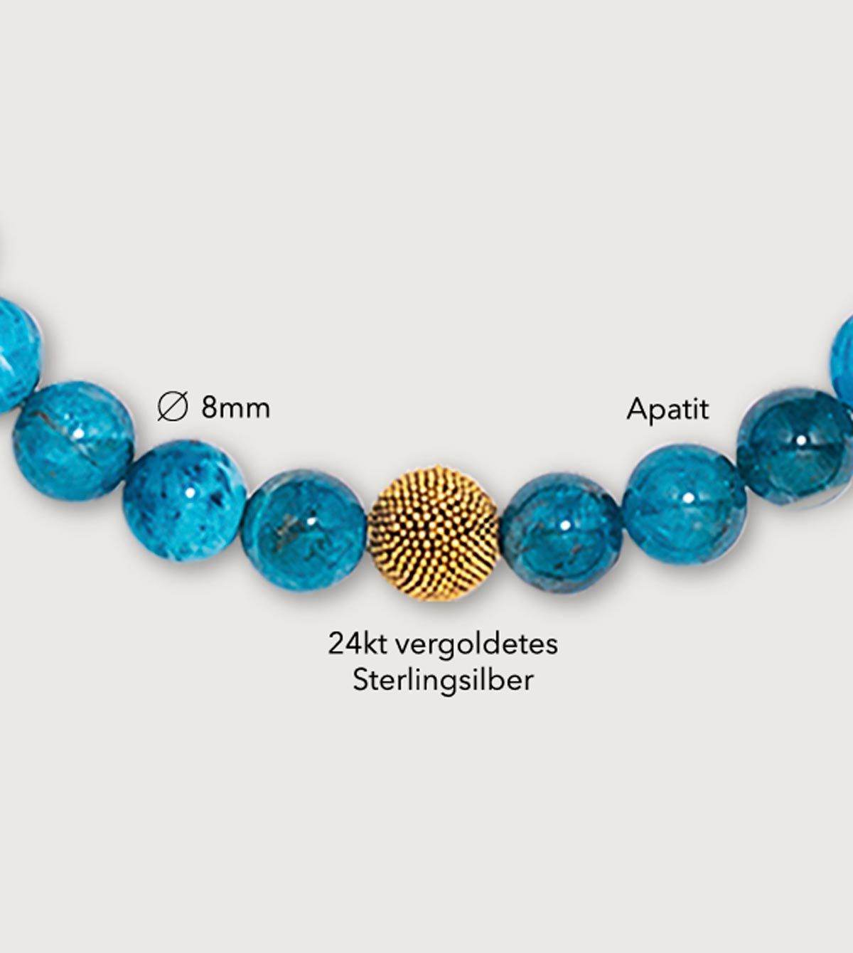 Mach Dich bereit, in den Glanz und die Schönheit dieses Apatit Perlenarmbands einzutauchen. Apatit besticht durch seine atemberaubenden Farbnuancen aus unterschiedlichen Blautönen und Grünschattierungen, die dem Armband eine unglaubliche Ausstrahlung verleihen. Das blau-grüne Mineral mobilisiert Energiereserven und stärkt die Eigenständigkeit, um so Lustlosigkeit und Routine hinter sich zu lassen. Die natürliche Schönheit und Leuchtkraft des Apatit verleiht dem Armband eine unverwechselbare Note. Lass dich von der magischen Anziehungskraft des Apatit und der zeitlosen Eleganz der vergoldeten Silberperle verzaubern & fühl Dich jeden Tag aufs Neue selbstbewusst und strahlend schön.