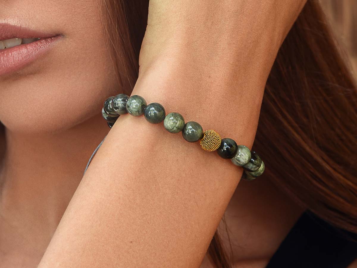 Alle Armbänder werden auf einem Stretchband aufgefädelt und gleiten so mühelos über Deine Hand. Wir empfehlen beim An- und Ablegen das Armband über den Handrücken zu rollen.
