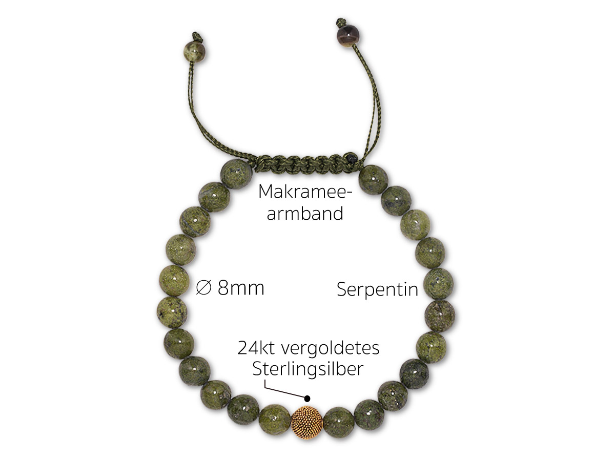 Die perfekte Symbiose von Serpentin & vergoldeter Silberperle verleiht diesem Armband eine unverwechselbare Ausstrahlung. Serpentin besticht durch seine intensive Farbgebung in verschiedenen Grüntönen. Die Perlen werden sorgfältig ausgewählt, um die einzigartige Maserung und Farbnuancen dieses begehrten Edelsteins zur Geltung zu bringen. Dabei ist er ist er gut gegen Stress und spendet innere Ruhe. Die matte Vergoldung der Silberperle verleiht dem Armband einen Hauch von Luxus, der Deinen Stil perfekt unterstreicht.