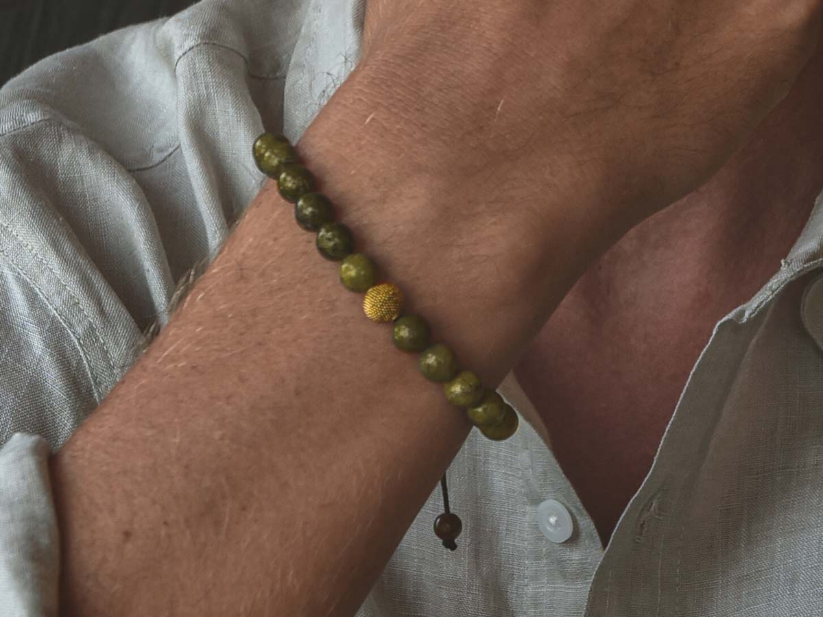 Die Kombination von Serpentin & vergoldeter Silberperle verleiht diesem Armband eine unverwechselbare Ausstrahlung. Serpentin besticht durch seine intensive Farbgebung in verschiedenen Grüntönen. Er ist er gut gegen Stress und spendet innere Ruhe. Die Perlen werden sorgfältig ausgewählt, um die einzigartige Maserung und Farbnuancen dieses begehrten Edelsteins zur Geltung zu bringen. Die matte Vergoldung der Silberperle verleiht dem Armband einen Hauch von Luxus, der Deinen Stil perfekt unterstreicht.
